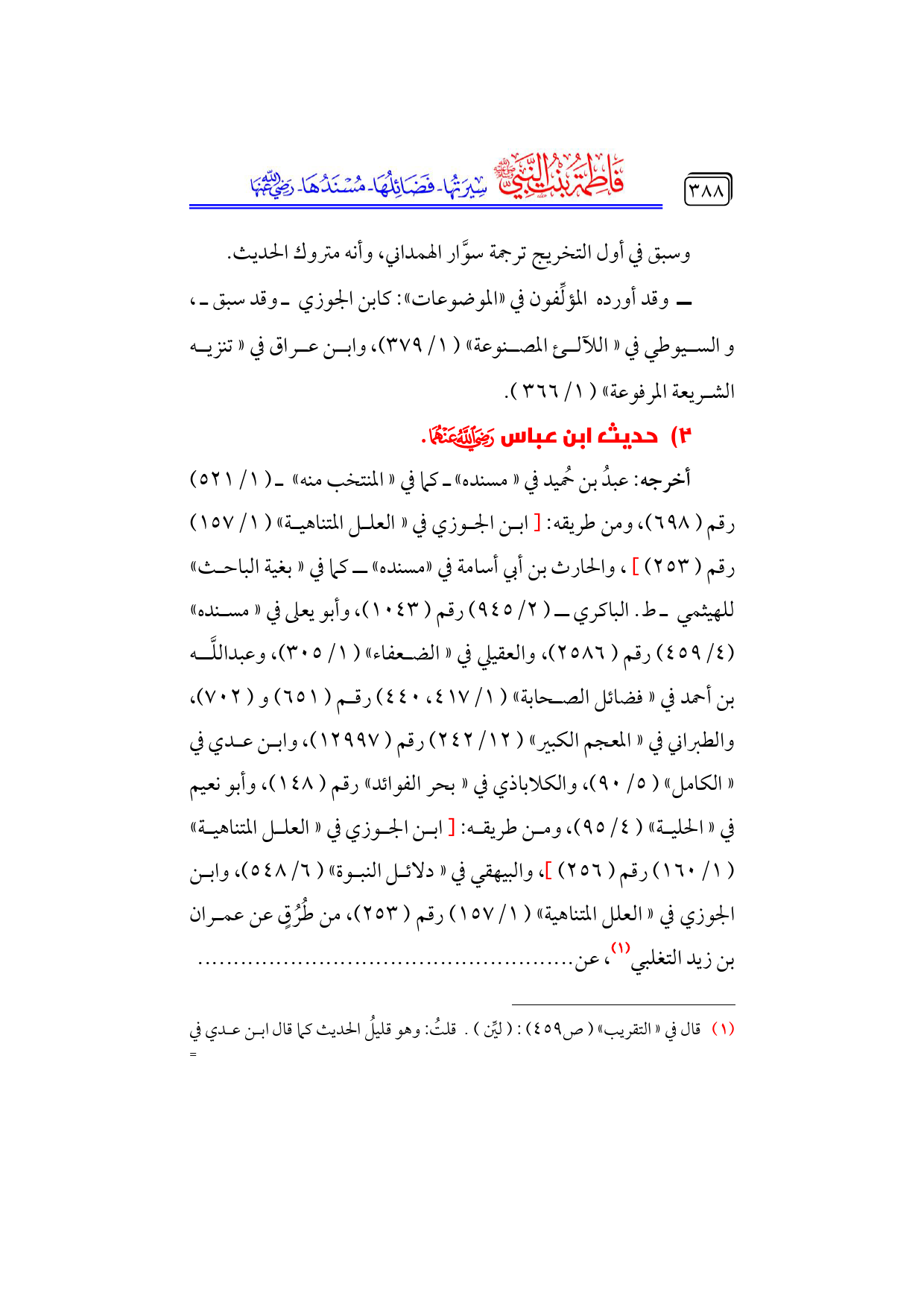 أخرجه: عبدُ بن حُميد في «مسنده» ـ كما في «المنتخب منه» ـ (١/ ٥٢١) رقم (٦٩٨)، ومن طريقه: [ابن الجوزي في «العلل المتناهية» (١/ ١٥٧) رقم (٢٥٣)]، والحارث بن أبي أسامة في «مسنده» ــ كما في «بغية الباحث» للهيثمي ـ ط. الباكري ــ (٢/ ٩٤٥) رقم (١٠٤٣)، وأبو يعلى في «مسنده» (٤/ ٤٥٩) رقم (٢٥٨٦)، والعقيلي في «الضعفاء» (١/ ٣٠٥)، وعبداللَّه بن أحمد في «فضائل الصحابة» (١/ ٤١٧، ٤٤٠) رقم (٦٥١) و (٧٠٢)، والطبراني في «المعجم الكبير» (١٢/ ٢٤٢) رقم (١٢٩٩٧)، وابن عدي في «الكامل» (٥/ ٩٠)، والكلاباذي في «بحر الفوائد» رقم (١٤٨)، وأبو نعيم في «الحلية» (٤/ ٩٥)، ومن طريقه: [ابن الجوزي في «العلل المتناهية» ... (١/ ١٦٠) رقم (٢٥٦)]، والبيهقي في «دلائل النبوة» (٦/ ٥٤٨)، وابن الجوزي في «العلل المتناهية» (١/ ١٥٧) رقم (٢٥٣)، من طُرُقٍ عن عمران بن زيد التغلبي (¬١)، عن .....................................................