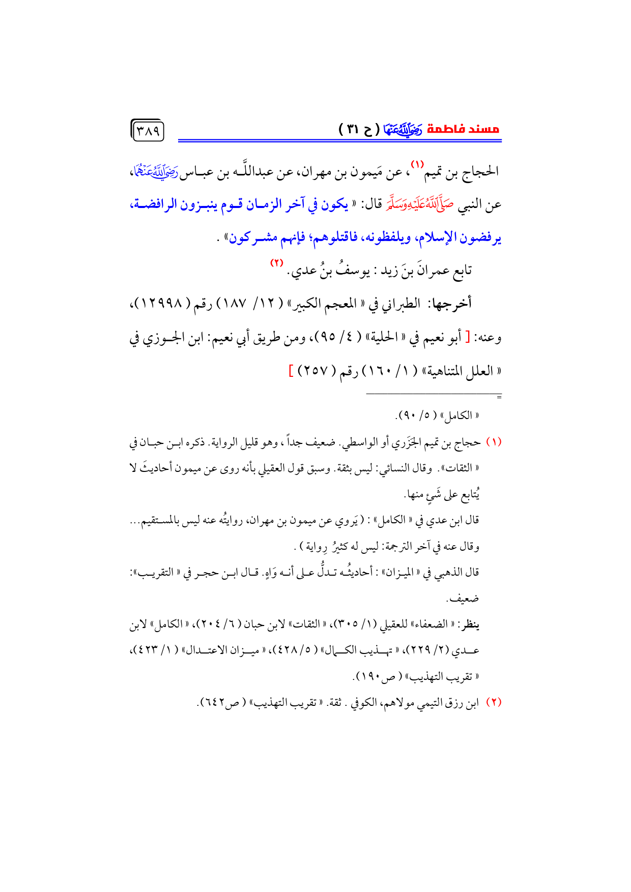 الحجاج بن تميم (¬١)، عن مَيمون بن مهران، عن عبداللَّه بن عباس - رضي الله عنهما -، عن النبي - صلى الله عليه وسلم - قال: «يكون في آخر الزمان قوم ينبزون الرافضة، يرفضون الإسلام، ويلفظونه، فاقتلوهم؛ فإنهم مشركون».
