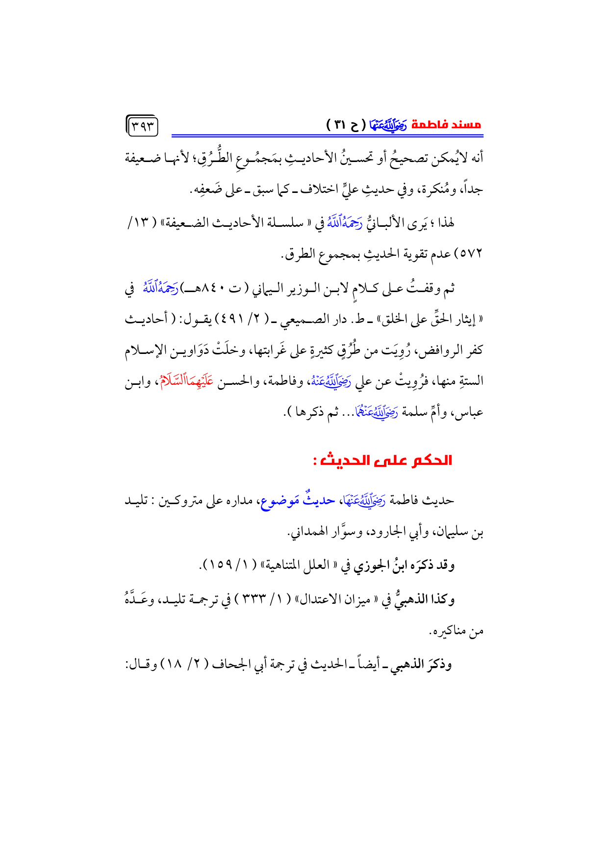 حديث فاطمة - رضي الله عنها -، حديثٌ مَوضوع، مداره على متروكين: تليد بن سليمان، وأبي الجارود، وسوَّار الهمداني.