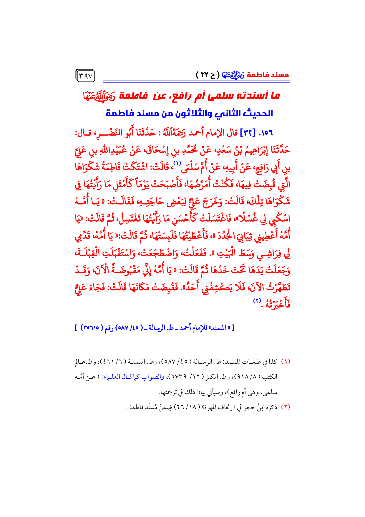 ١٥٦. [٣٢] قال الإمام أحمد - رحمه الله -: حَدَّثَنَا أَبُو النَّضْرِ، قال: حَدَّثَنَا إِبْرَاهِيمُ بْنُ سَعْدٍ، عَنْ مُحَمَّدِ بنِ إِسْحَاقَ، عَنْ عُبَيْدِاللهِ بنِ عَلِيِّ بنِ أَبِي رَافِعٍ، عَنْ أَبِيهِ، عَنْ أُمِّ سَلْمَى (¬١)، قَالَتْ: اشْتَكَتْ فَاطِمَةُ شَكْوَاهَا الَّتِي قُبِضَتْ فِيهَا، فَكُنْتُ أُمَرِّضُهَا، فَأَصْبَحَتْ يَوْمَاً كَأَمْثَلِ مَا رَأَيْتُهَا فِي شَكْوَاهَا تِلْكَ، قَالَتْ: وَخَرَجَ عَلِيٌّ لِبَعْضِ حَاجَتِهِ، فَقَالَتْ: «يَا أُمَّهْ اسْكُبِي لِي غُسْلًا»، فَاغْتَسَلَتْ كَأَحْسَنِ مَا رَأَيْتُهَا تَغْتَسِلُ، ثُمَّ قَالَتْ: «يَا أُمَّهْ أَعْطِينِي ثِيَابِيَ الْجُدُدَ»، فَأَعْطَيْتُهَا فَلَبِسَتْهَا، ثُمَّ قَالَتْ: «يَا أُمَّهْ، قَدِّمِي لِي فِرَاشِي وَسَطَ الْبَيْتِ». فَفَعَلْتُ، وَاضْطَجَعَتْ، وَاسْتَقْبَلَتِ الْقِبْلَةَ، وَجَعَلَتْ يَدَهَا تَحْتَ خَدِّهَا ثُمَّ قَالَتْ: «يَا أُمَّهْ إِنِّي مَقْبُوضَةٌ الْآنَ، وَقَدْ تَطَهَّرْتُ الآنَ، فَلَا يَكْشِفُنِي أَحَدٌ». فَقُبِضَتْ مَكَانَهَا قَالَتْ: فَجَاءَ عَلِيٌّ فَأَخْبَرْتُهُ. (¬٢)