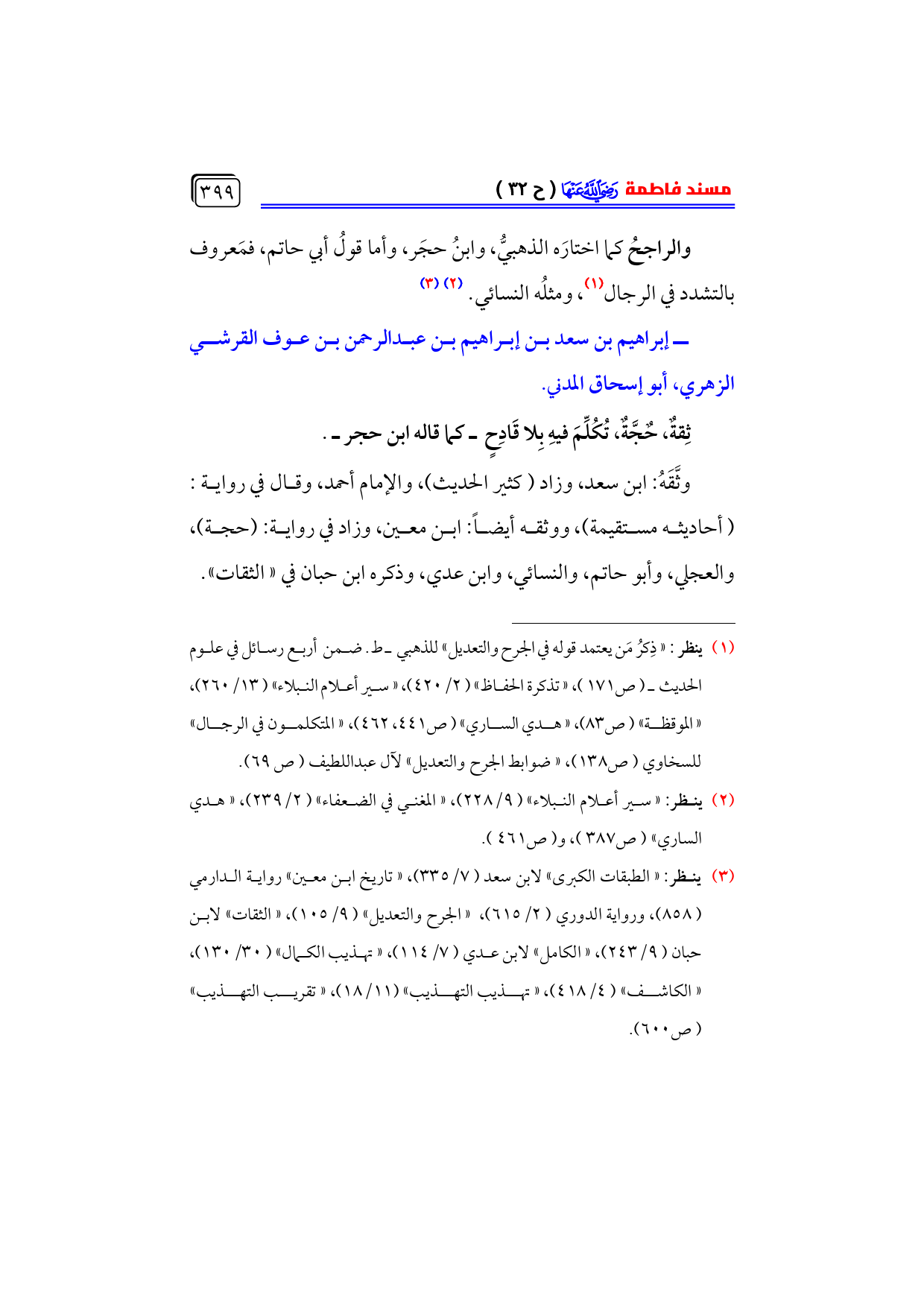 (¬١) ينظر: «ذِكرُ مَن يعتمد قوله في الجرح والتعديل» للذهبي ـ ط. ضمن أربع رسائل في علوم الحديث ـ (ص ١٧١)، «تذكرة الحفاظ» (٢/ ٤٢٠)، «سير أعلام النبلاء» (١٣/ ٢٦٠)، ... «الموقظة» (ص ٨٣)، «هدي الساري» (ص ٤٤١، ٤٦٢)، «المتكلمون في الرجال» للسخاوي (ص ١٣٨)، «ضوابط الجرح والتعديل» لآل عبداللطيف (ص ٦٩).