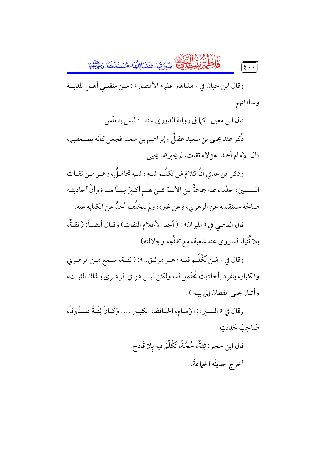 قال ابن حجر: ثِقةٌ، حُجَّةٌ، تُكُلِّمَ فيه بِلا قَادح.