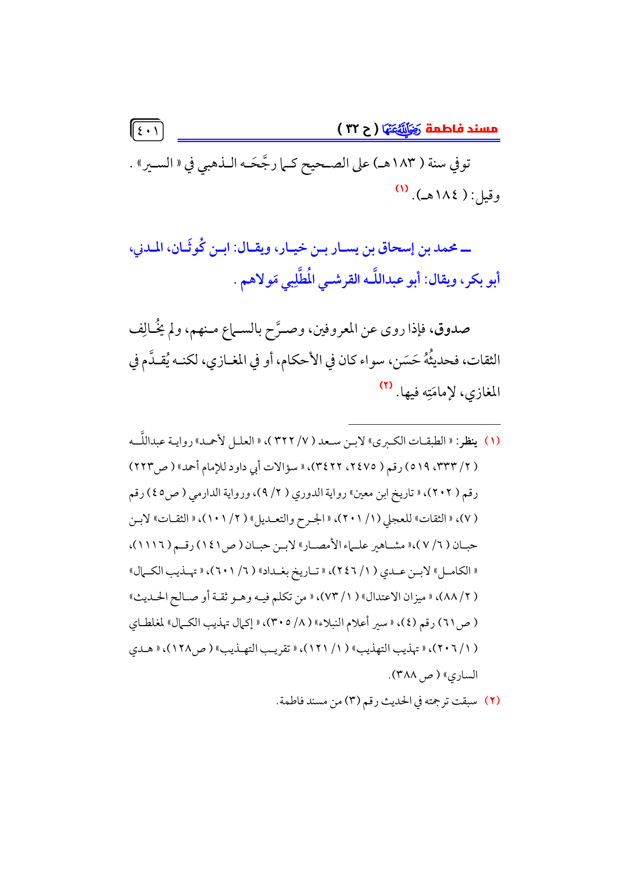 ــ محمد بن إسحاق بن يسار بن خيار، ويقال: ابن كُوثَان، المدني، ... أبو بكر، ويقال: أبو عبداللَّه القرشي المُطَّلِبي مَولاهم.