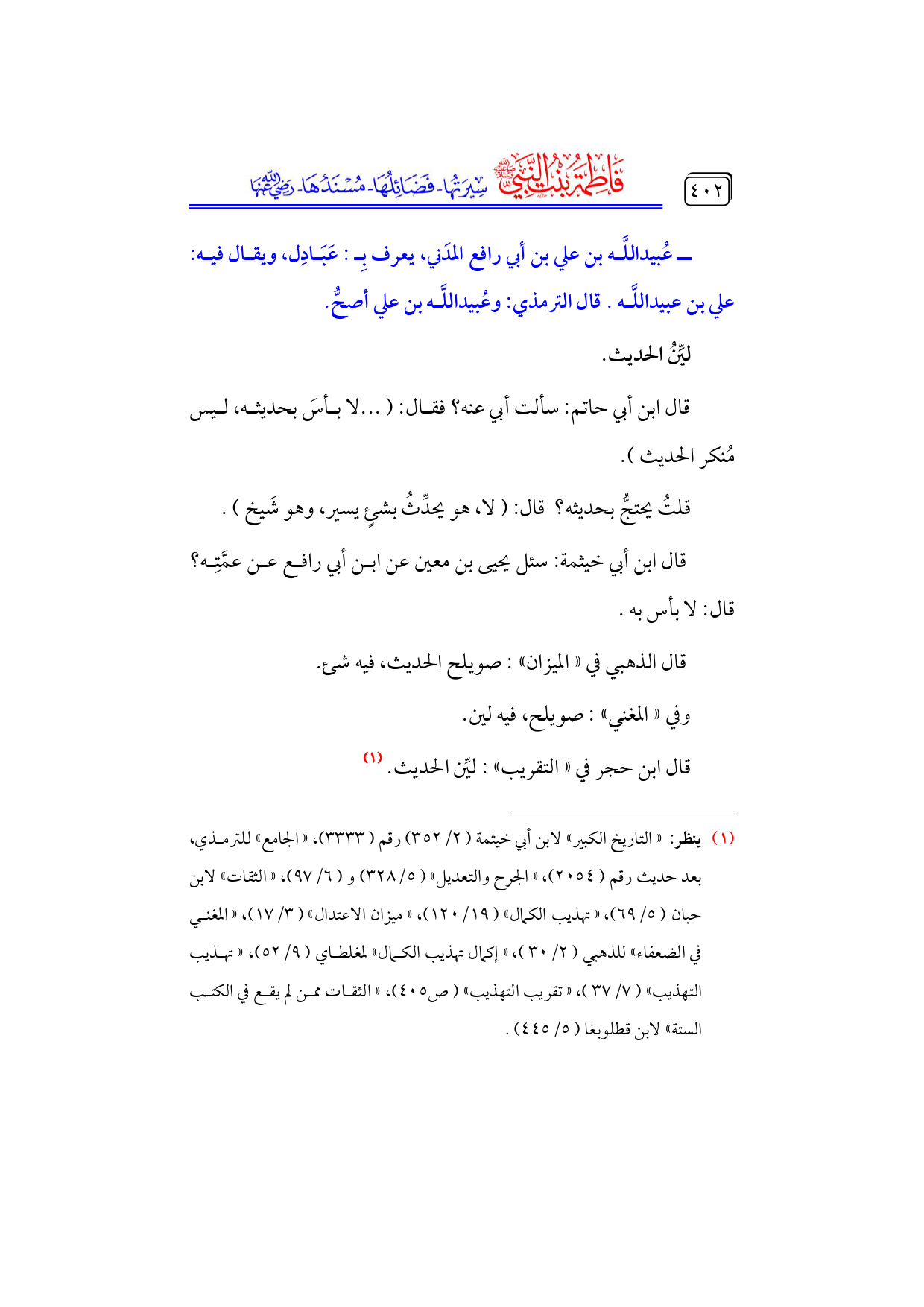 ــ عُبيداللَّه بن علي بن أبي رافع المدَني، يعرف بِـ: عَبَادِل، ويقال فيه: علي بن عبيداللَّه. قال الترمذي: وعُبيداللَّه بن علي أصحُّ.