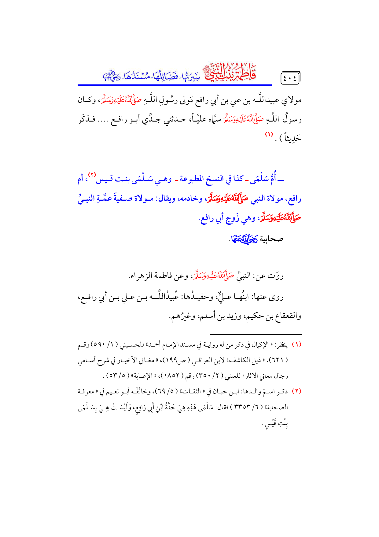 (¬٢) ذكر اسمَ والدها: ابن حبان في «الثقات» (٥/ ٦٩)، وخالَفَه أبو نعيم في «معرفة الصحابة» (٦/ ٣٣٥٣) فقال: سَلْمَى هَذِهِ هِيَ جَدَّةُ ابْنِ أَبِي رَافِعٍ، وَلَيْسَتْ هِيَ بِسَلْمَى بِنْتِ قَيْسٍ.