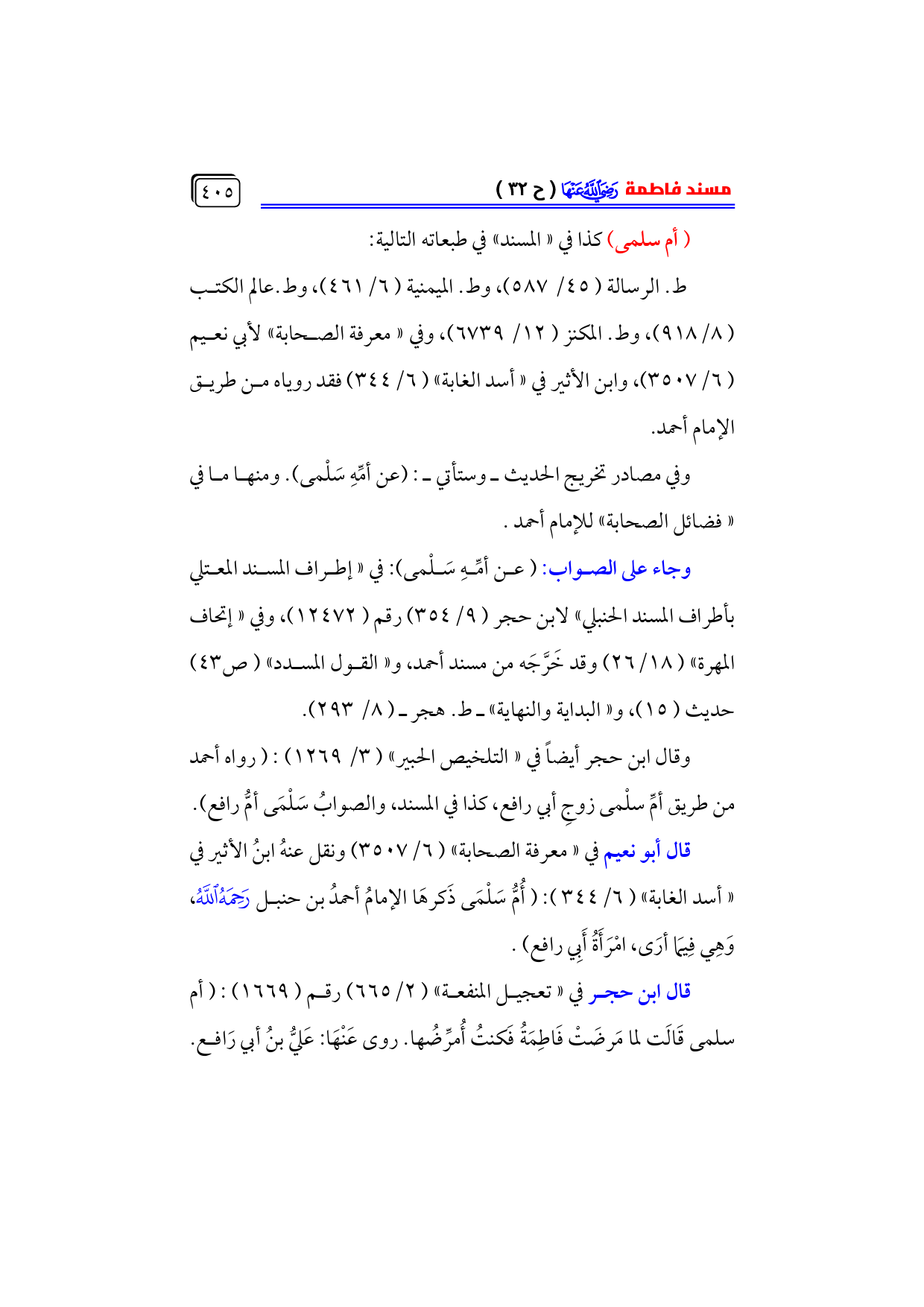 وقال ابن حجر أيضاً في «التلخيص الحبير» (٣/ ١٢٦٩): (رواه أحمد من طريق أمِّ سلْمى زوجِ أبي رافع، كذا في المسند، والصوابُ سَلْمَى أمُّ رافع).
