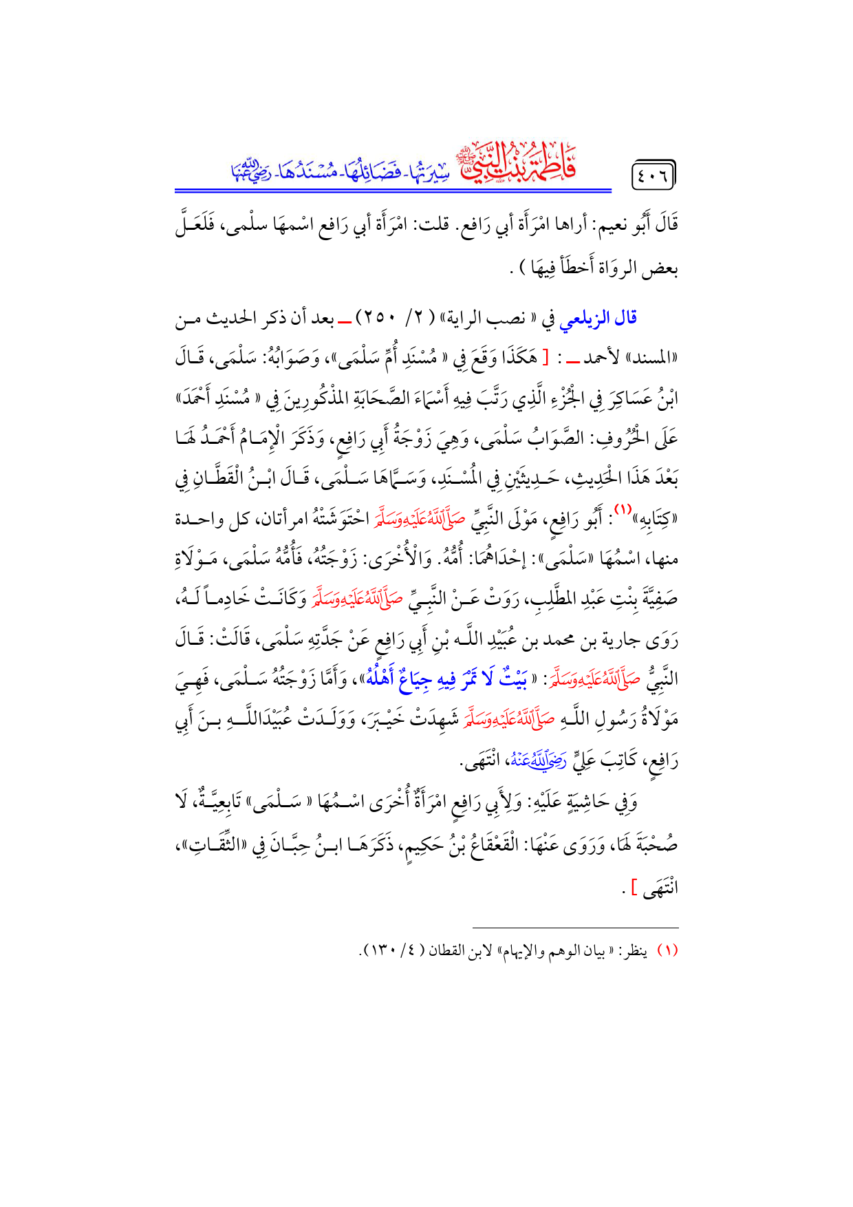 قال الزيلعي في «نصب الراية» (٢/ ٢٥٠) ــ بعد أن ذكر الحديث من «المسند» لأحمد ــ: [هَكَذَا وَقَعَ فِي «مُسْنَدِ أُمِّ سَلْمَى»، وَصَوَابُهُ: سَلْمَى، قَالَ ابْنُ عَسَاكِرَ فِي الْجُزْءِ الَّذِي رَتَّبَ فِيهِ أَسْمَاءَ الصَّحَابَةِ المذْكُورِينَ فِي «مُسْنَدِ أَحْمَدَ» عَلَى الْحُرُوفِ: الصَّوَابُ سَلْمَى، وَهِيَ زَوْجَةُ أَبِي رَافِعٍ، وَذَكَرَ الْإِمَامُ أَحْمَدُ لَهَا بَعْدَ هَذَا الْحَدِيثِ، حَدِيثَيْنِ فِي المُسْنَدِ، وَسَمَّاهَا سَلْمَى، قَالَ ابْنُ الْقَطَّانِ فِي «كِتَابِهِ» (¬١): أَبُو رَافِعٍ، مَوْلَى النَّبِيِّ - صلى الله عليه وسلم - احْتَوَشَتْهُ امرأتان، كل واحدة منها، اسْمُهَا «سَلْمَى»: إحْدَاهُمَا: أُمُّهُ. وَالْأُخْرَى: زَوْجَتُهُ، فَأُمُّهُ سَلْمَى، مَوْلَاةِ صَفِيَّةَ بِنْتِ عَبْدِ المطَّلِبِ، رَوَتْ عَنْ النَّبِيِّ - صلى الله عليه وسلم - وَكَانَتْ خَادِماً لَهُ، رَوَى جارية بن محمد بن عُبَيْدِ اللَّه بْنِ أَبِي رَافِعٍ عَنْ جَدَّتِهِ سَلْمَى، قَالَتْ: قَالَ النَّبِيُّ - صلى الله عليه وسلم -: «بَيْتٌ لَا تَمْرَ فِيهِ جِيَاعٌ أَهْلُهُ»، وَأَمَّا زَوْجَتُهُ سَلْمَى، فَهِيَ مَوْلَاةُ رَسُولِ اللَّهِ - صلى الله عليه وسلم - شَهِدَتْ خَيْبَرَ، وَوَلَدَتْ عُبَيْدَاللَّهِ بنَ أَبِي رَافِعٍ، كَاتِبَ عَلِيٍّ - رضي الله عنه -، انْتَهَى.