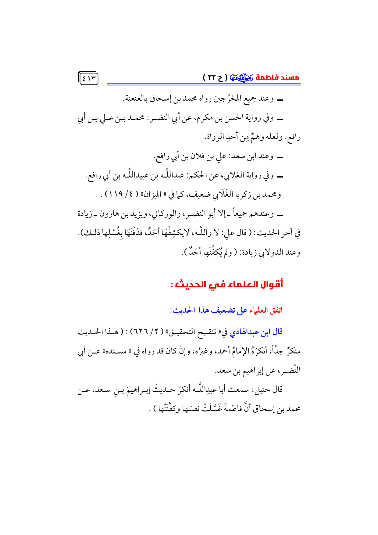 قال حنبل: سمعت أبا عبدِاللَّه أنكرَ حديثَ إبراهيمَ بنِ سعد، عن محمد بن إسحاق أنَّ فاطمةَ غَسَّلَتْ نفسَها وكفَّنَتْها).