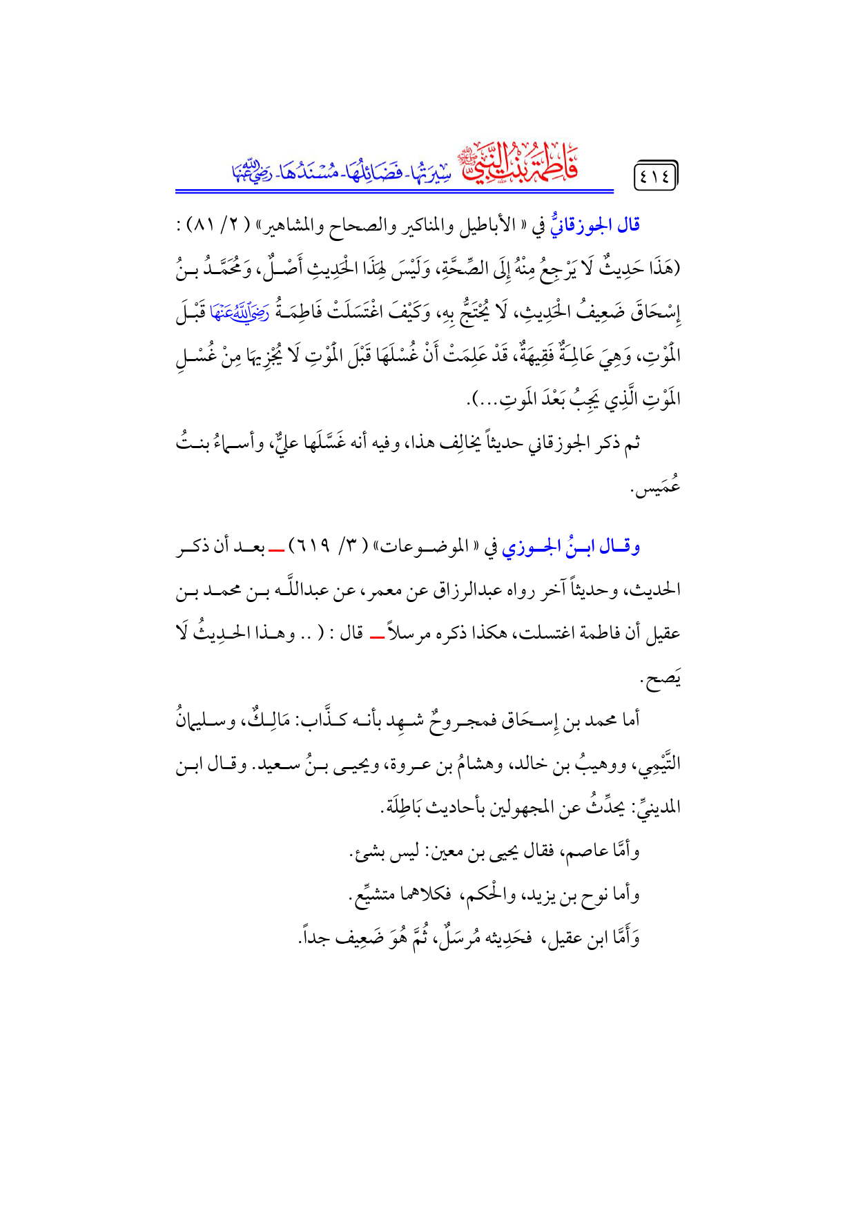 قال الجوزقانيُّ في «الأباطيل والمناكير والصحاح والمشاهير» (٢/ ٨١): (هَذَا حَدِيثٌ لَا يَرْجِعُ مِنْهُ إِلَى الصِّحَّةِ، وَلَيْسَ لِهَذَا الْحَدِيثِ أَصْلٌ، وَمُحَمَّدُ بنُ إِسْحَاقَ ضَعِيفُ الْحَدِيثِ، لَا يُحْتَجُّ بِهِ، وَكَيْفَ اغْتَسَلَتْ فَاطِمَةُ - رضي الله عنها - قَبْلَ الْمَوْتِ، وَهِيَ عَالِمَةٌ فَقِيهَةٌ، قَدْ عَلِمَتْ أَنْ غُسْلَهَا قَبْلَ الْمَوْتِ لَا يُجْزِيهَا مِنْ غُسْلِ المَوْتِ الَّذِي يَجِبُ بَعْدَ المَوتِ ... ).
