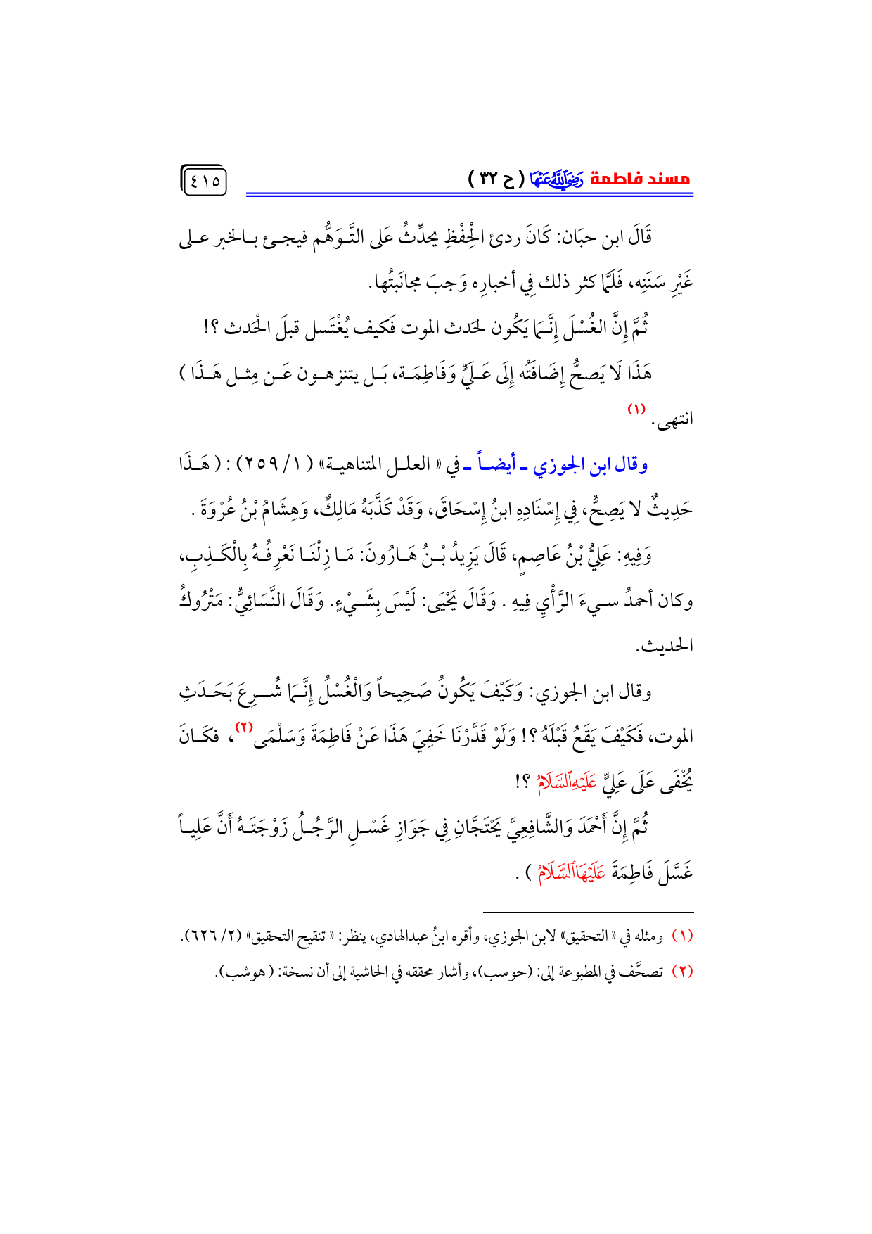 وقال ابن الجوزي: وَكَيْفَ يَكُونُ صَحِيحاً وَالْغُسْلُ إِنَّمَا شُرِعَ بَحَدَثِ الموت، فَكَيْفَ يَقَعُ قَبْلَهُ؟ ! وَلَوْ قَدَّرْنَا خَفِيَ هَذَا عَنْ فَاطِمَةَ وَسَلْمَى (¬٢)، فكَانَ يُخْفَى عَلَى عَلِيٍّ - عليه السلام -؟ !