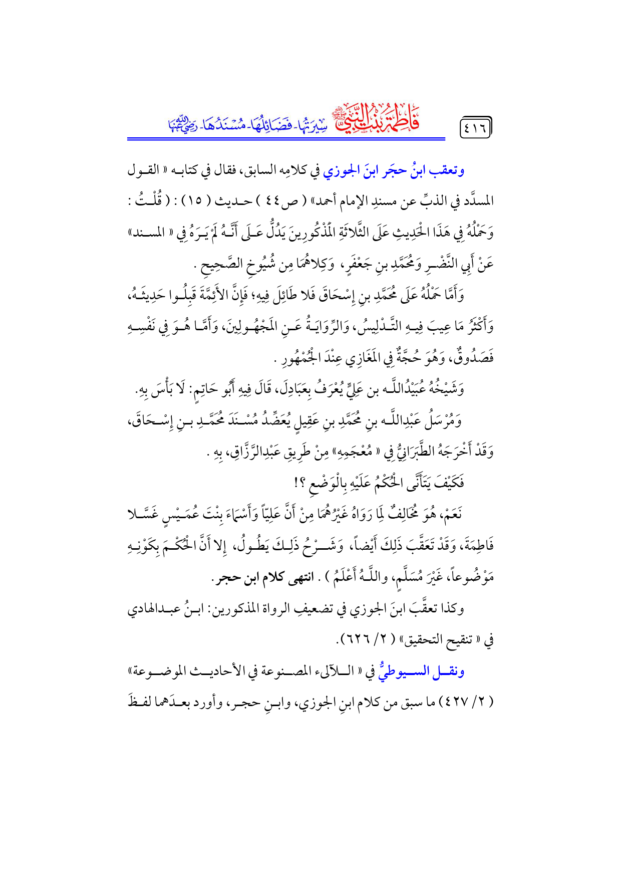 وتعقب ابنُ حجَر ابنَ الجوزي في كلامِه السابق، فقال في كتابه «القول المسدَّد في الذبِّ عن مسندِ الإمام أحمد» (ص ٤٤) حديث (١٥): (قُلْتُ: وَحَمْلُهُ فِي هَذَا الْحَدِيثِ عَلَى الثَّلاثَةِ الْمَذْكُورِينَ يَدُلُّ عَلَى أَنَّهُ لَمْ يَرَهُ فِي «المسند» عَنْ أَبِي النَّضْرِ وَمُحَمَّدِ بنِ جَعْفَرٍ، وَكِلاهُمَا مِن شُيُوخِ الصَّحِيحِ.