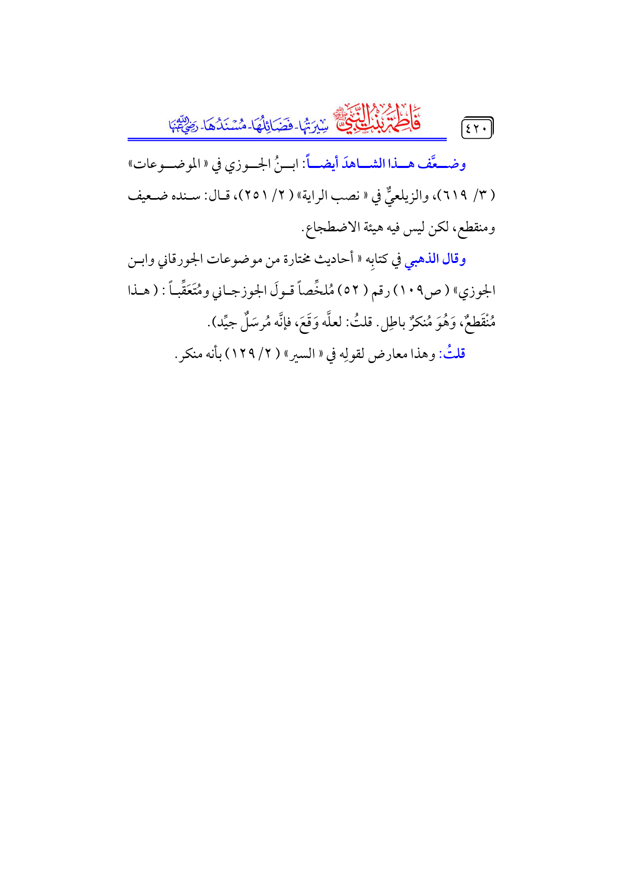 وقال الذهبي في كتابِه «أحاديث مختارة من موضوعات الجورقاني وابن الجوزي» (ص ١٠٩) رقم (٥٢) مُلخِّصاً قولَ الجوزجاني ومُتَعَقِّباً: (هذا مُنْقَطعٌ، وَهُوَ مُنكرٌ باطِل. قلتُ: لعلَّه وَقَعَ، فإنَّه مُرسَلٌ جيِّد).