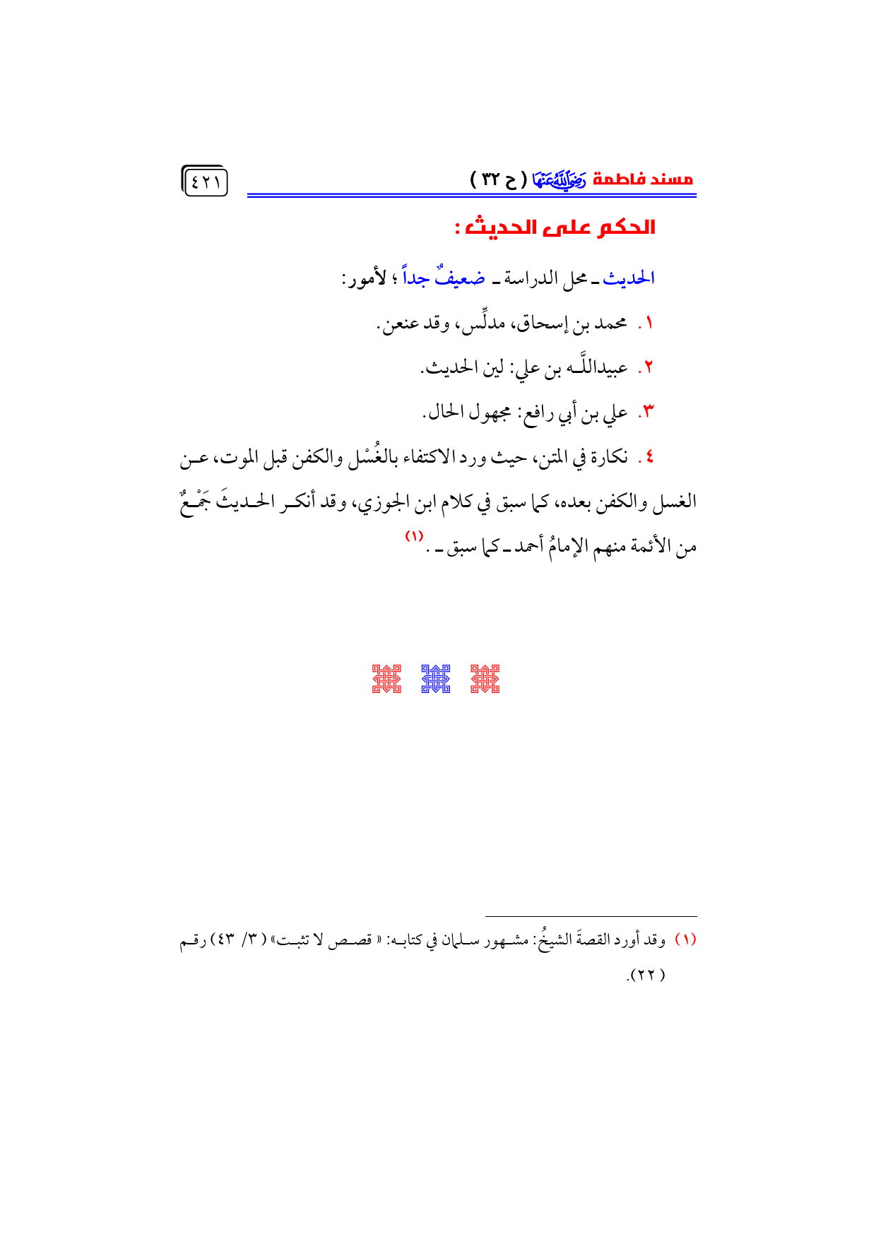 ٤. نكارة في المتن، حيث ورد الاكتفاء بالغُسْل والكفن قبل الموت، عن الغسل والكفن بعده، كما سبق في كلام ابن الجوزي، وقد أنكر الحديثَ جَمْعٌ من الأئمة منهم الإمامُ أحمد ـ كما سبق ـ. (¬١)
