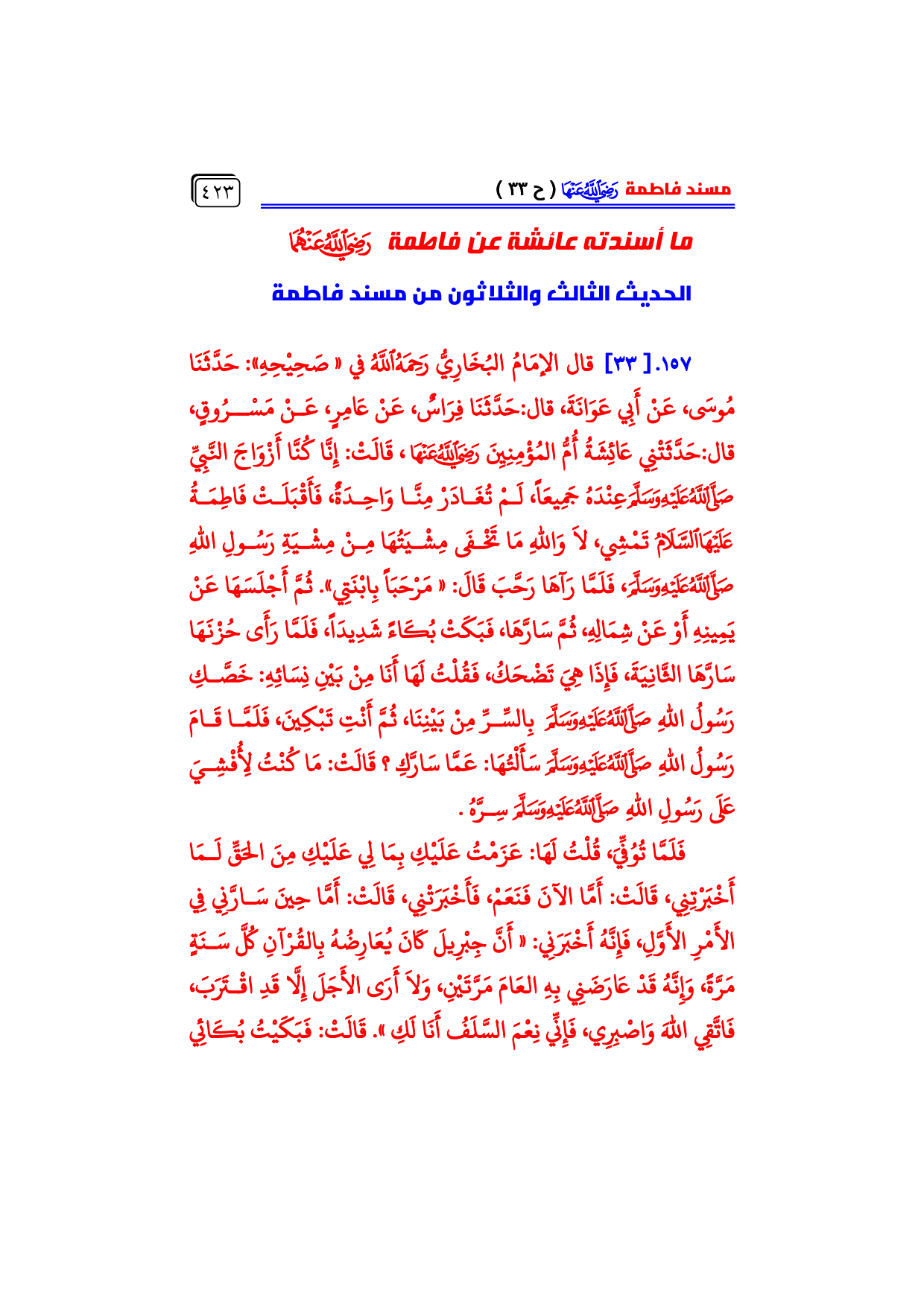 ١٥٧. [٣٣] قال الإمَامُ البُخَارِيُّ - رحمه الله - في «صَحِيْحِهِ»: حَدَّثَنَا مُوسَى، عَنْ أَبِي عَوَانَةَ، قال: حَدَّثَنَا فِرَاسٌ، عَنْ عَامِرٍ، عَنْ مَسْرُوقٍ، قال: حَدَّثَتْنِي عَائِشَةُ أُمُّ المُؤْمِنِيِنَ - رضي الله عنها -، قَالَتْ: إِنَّا كُنَّا أَزْوَاجَ النَّبِيِّ - صلى الله عليه وسلم - عِنْدَهُ جَمِيعَاً، لَمْ تُغَادَرْ مِنَّا وَاحِدَةٌ، فَأَقْبَلَتْ فَاطِمَةُ - عليها السلام - تَمْشِي، لا وَاللهِ مَا تَخْفَى مِشْيَتُهَا مِنْ مِشْيَةِ رَسُولِ اللهِ - صلى الله عليه وسلم -، فَلَمَّا رَآهَا رَحَّبَ قَالَ: «مَرْحَبَاً بِابْنَتِي». ثُمَّ أَجْلَسَهَا عَنْ يَمِينِهِ أَوْ عَنْ شِمَالِهِ، ثُمَّ سَارَّهَا، فَبَكَتْ بُكَاءً شَدِيدَاً، فَلَمَّا رَأَى حُزْنَهَا سَارَّهَا الثَّانِيَةَ، فَإِذَا هِيَ تَضْحَكُ، فَقُلْتُ لَهَا أَنَا مِنْ بَيْنِ نِسَائِهِ: خَصَّكِ رَسُولُ اللهِ - صلى الله عليه وسلم - بِالسِّرِّ مِنْ بَيْنِنَا، ثُمَّ أَنْتِ تَبْكِينَ، فَلَمَّا قَامَ رَسُولُ اللهِ - صلى الله عليه وسلم - سَأَلْتُهَا: عَمَّا سَارَّكِ؟ قَالَتْ: مَا كُنْتُ لِأُفْشِيَ عَلَى رَسُولِ اللهِ - صلى الله عليه وسلم - سِرَّهُ.