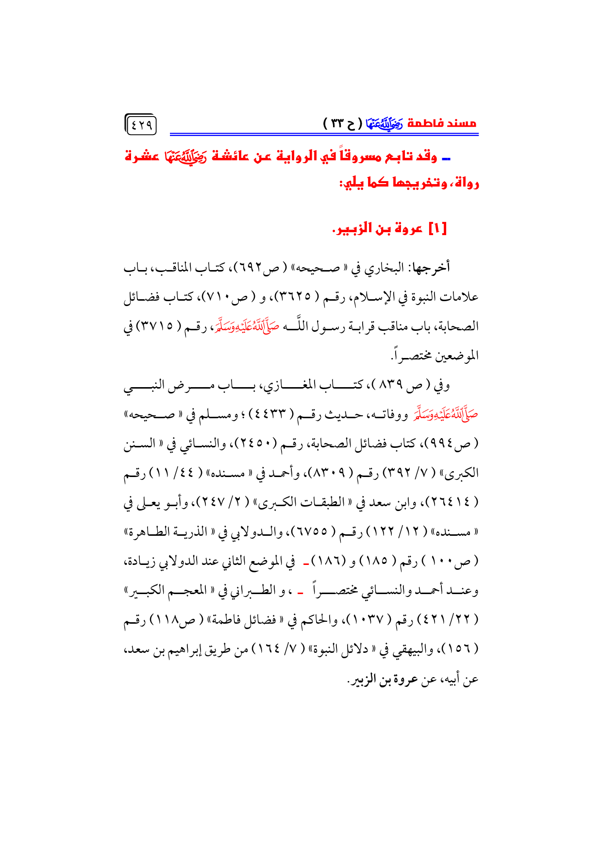 وفي (ص ٨٣٩)، كتاب المغازي، باب مرض النبي - صلى الله عليه وسلم - ووفاته، حديث رقم (٤٤٣٣)؛ ومسلم في «صحيحه» ... (ص ٩٩٤)، كتاب فضائل الصحابة، رقم (٢٤٥٠)، والنسائي في «السنن الكبرى» (٧/ ٣٩٢) رقم (٨٣٠٩)، وأحمد في «مسنده» (٤٤/ ١١) رقم ... (٢٦٤١٤)، وابن سعد في «الطبقات الكبرى» (٢/ ٢٤٧)، وأبو يعلى في ... «مسنده» (١٢/ ١٢٢) رقم (٦٧٥٥)، والدولابي في «الذرية الطاهرة» ... (ص ١٠٠) رقم (١٨٥) و (١٨٦) ـ في الموضع الثاني عند الدولابي زيادة، وعند أحمد والنسائي مختصراً ـ، والطبراني في «المعجم الكبير» ... (٢٢/ ٤٢١) رقم (١٠٣٧)، والحاكم في «فضائل فاطمة» (ص ١١٨) رقم (١٥٦)، والبيهقي في «دلائل النبوة» (٧/ ١٦٤) من طريق إبراهيم بن سعد، عن أبيه، عن عروة بن الزبير.