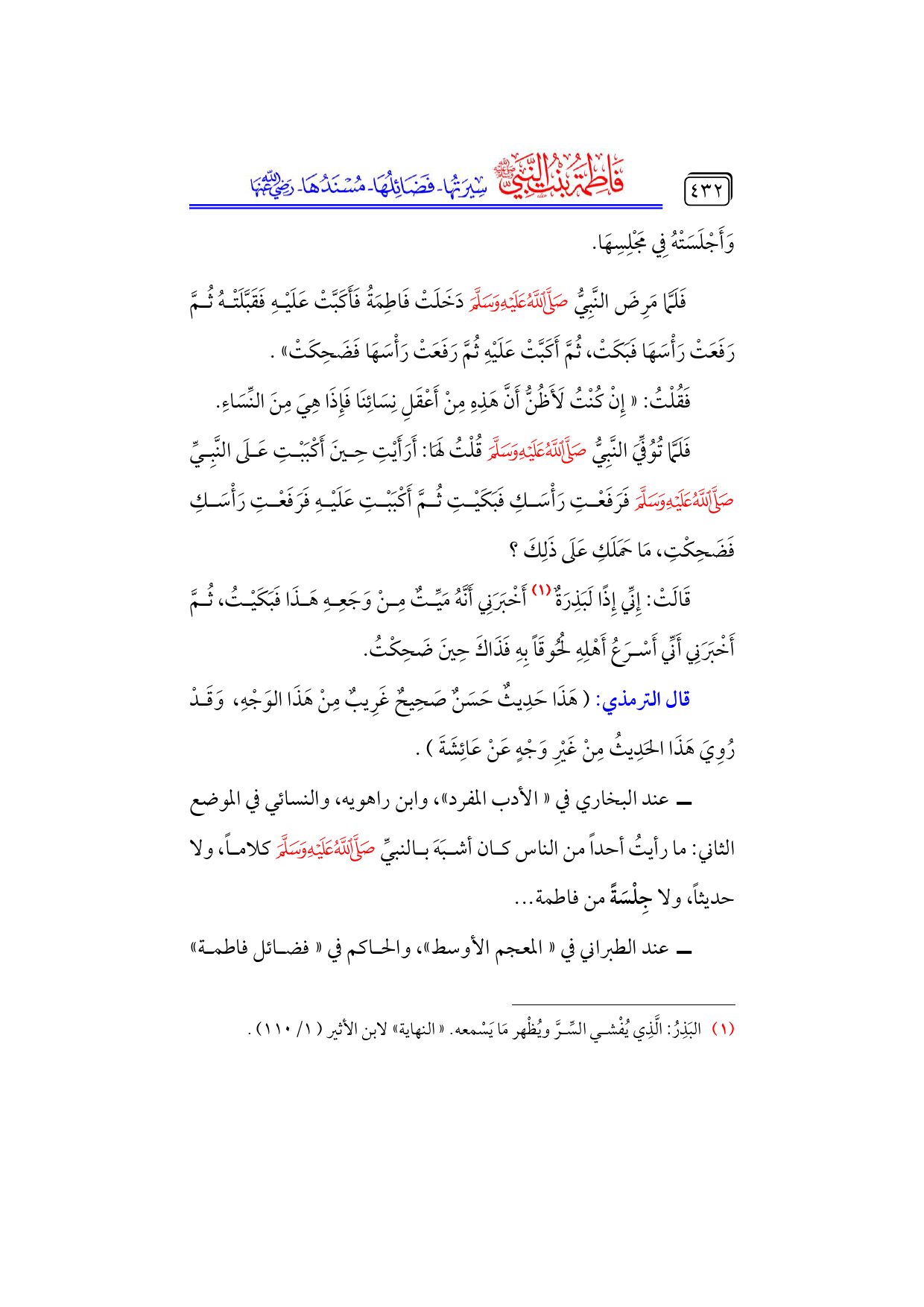 كتاب فاطمة بنت النبي - صلى الله عليه وسلم - سيرتها، فضائلها، مسندها - رضي الله عنها - (اسم الجزء: 6)
