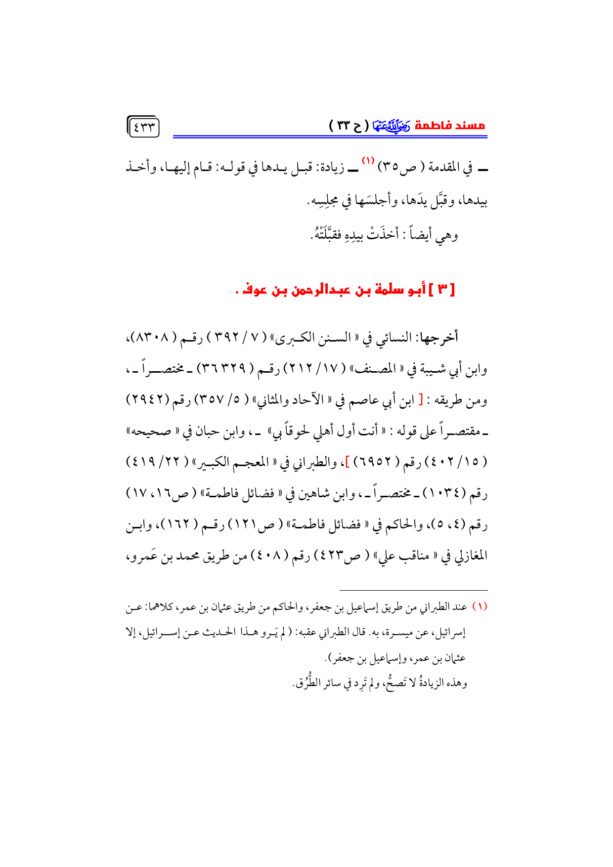 في المقدمة (ص ٣٥) (¬١) ــ زيادة: قبل يدها في قوله: قام إليها، وأخذ بيدها، وقبَّل يدَها، وأجلسَها في مجلِسِه.