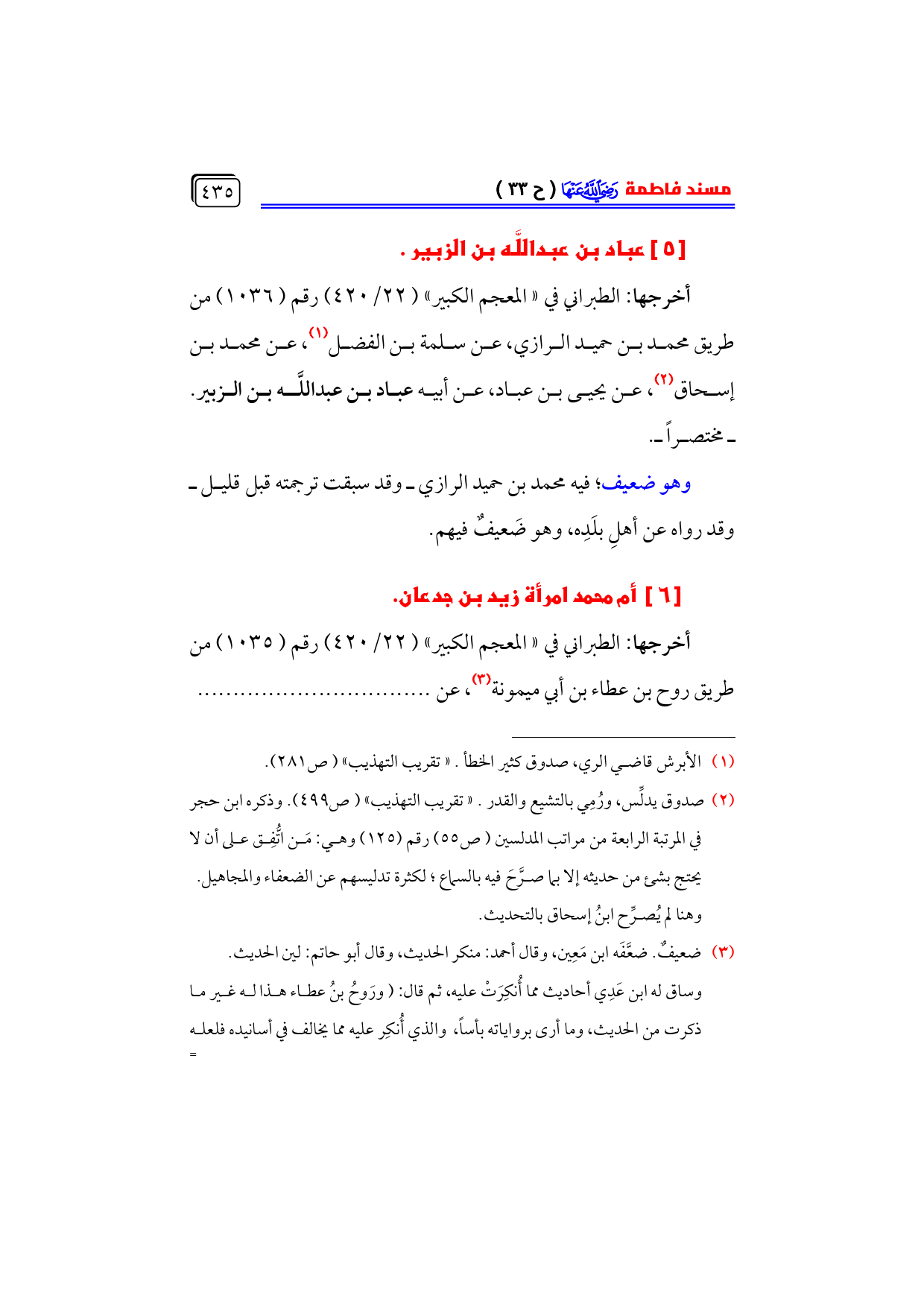 أخرجها: الطبراني في «المعجم الكبير» (٢٢/ ٤٢٠) رقم (١٠٣٦) من طريق محمد بن حميد الرازي، عن سلمة بن الفضل (¬١)، عن محمد بن إسحاق (¬٢)، عن يحيى بن عباد، عن أبيه عباد بن عبداللَّه بن الزبير. ... ـ مختصراً ـ.