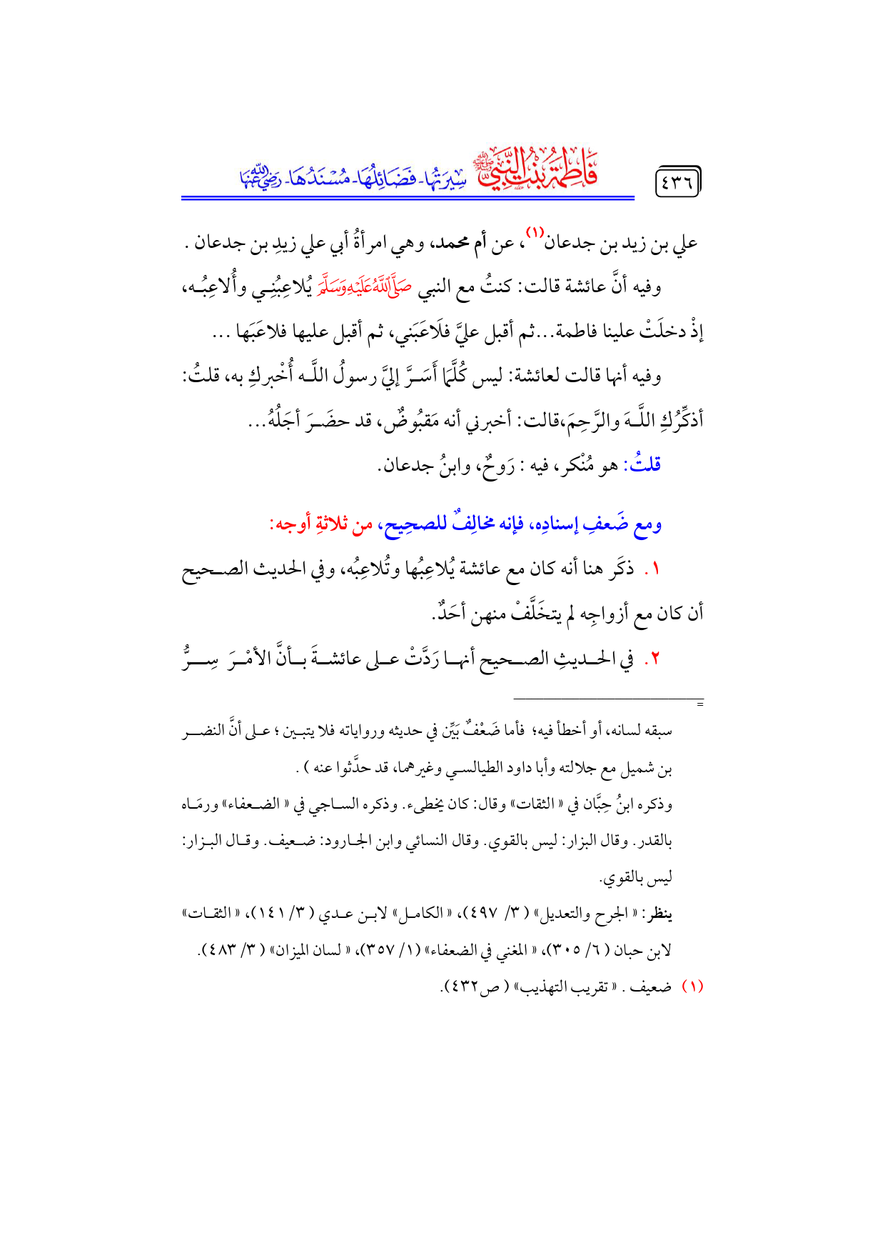 وفيه أنَّ عائشة قالت: كنتُ مع النبي - صلى الله عليه وسلم - يُلاعِبُنِي وأُلاعِبُه، إذْ دخلَتْ علينا فاطمة ... ثم أقبل عليَّ فلَاعَبَني، ثم أقبل عليها فلاعَبَها ...