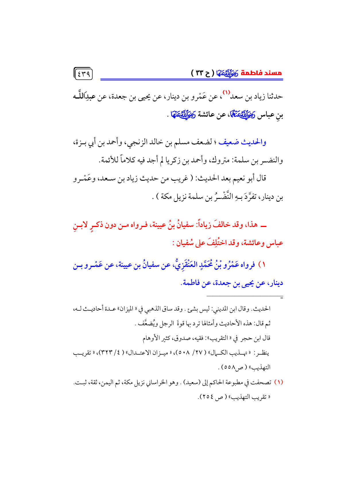 ١) فرواه عَمْرُو بْنُ مُحَمَّدٍ العَنْقَزِيُّ، عن سفيانُ بن عيينة، عن عَمْرو بن دينار، عن يحيى بن جعدة، عن فاطمة.