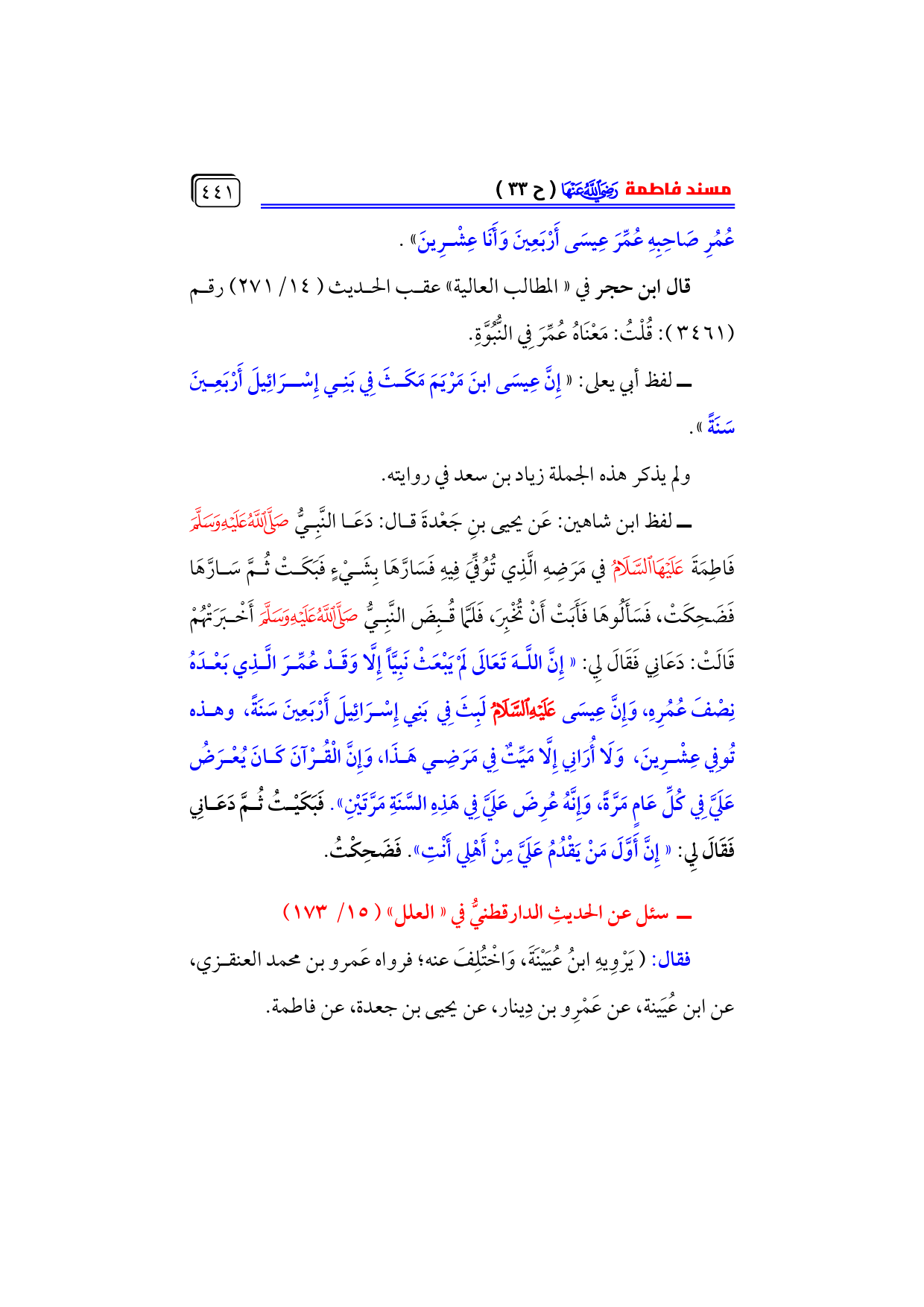 ــ لفظ ابن شاهين: عَن يحيى بنِ جَعْدةَ قال: دَعَا النَّبِيُّ - صلى الله عليه وسلم - فَاطِمَةَ - عليها السلام - في مَرَضِهِ الَّذِي تُوُفِّيَ فِيهِ فَسَارَّهَا بِشَيْءٍ فَبَكَتْ ثُمَّ سَارَّهَا فَضَحِكَتْ، فَسَأَلُوهَا فَأَبَتْ أَنْ تُخْبِرَ، فَلَمَّا قُبِضَ النَّبِيُّ - صلى الله عليه وسلم - أَخْبَرَتْهُمْ قَالَتْ: دَعَانِي فَقَالَ لِي: «إِنَّ اللَّهَ تَعَالَى لَمْ يَبْعَثْ نَبِيَّاً إِلَّا وَقَدْ عُمِّرَ الَّذِي بَعْدَهُ نِصْفَ عُمُرِهِ، وَإِنَّ عِيسَى - عليه السلام - لَبِثَ فِي بَنِي إِسْرَائِيلَ أَرْبَعِينَ سَنَةً، وهذه تُوفِي عِشْرِينَ، وَلَا أُرَانِي إِلَّا مَيِّتٌ فِي مَرَضِي هَذَا، وَإِنَّ الْقُرْآنَ كَانَ يُعْرَضُ عَلَيَّ فِي كُلِّ عَامٍ مَرَّةً، وَإِنَّهُ عُرِضَ عَلَيَّ فِي هَذِهِ السَّنَةِ مَرَّتَيْنِ». فَبَكَيْتُ ثُمَّ دَعَانِي فَقَالَ لِي: «إِنَّ أَوَّلَ مَنْ يَقْدُمُ عَلَيَّ مِنْ أَهْلِي أَنْتِ». فَضَحِكْتُ.