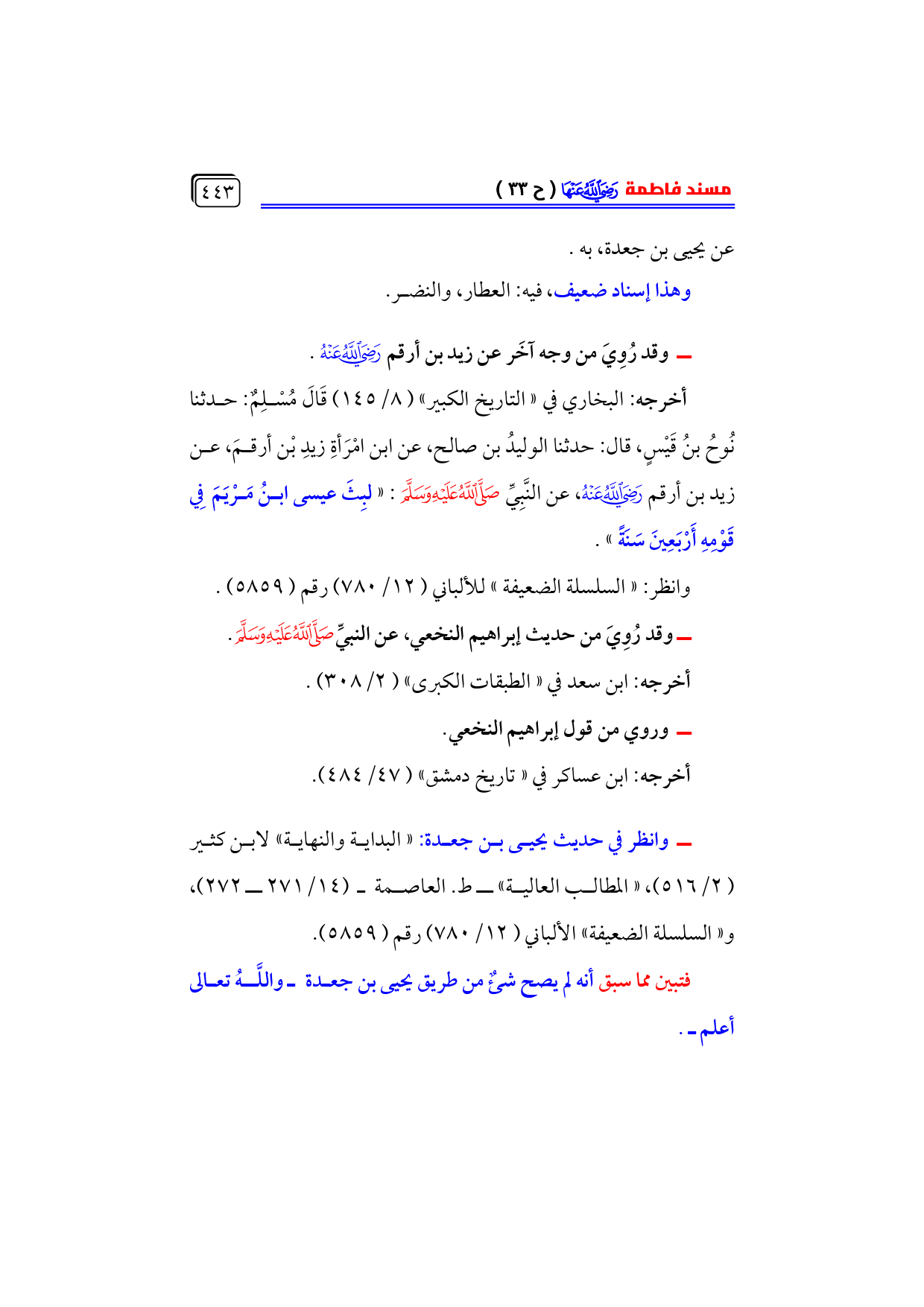 ــ وانظر في حديث يحيى بن جعدة: «البداية والنهاية» لابن كثير ... (٢/ ٥١٦)، «المطالب العالية» ـ ط. العاصمة ـ (١٤/ ٢٧١ ـ ٢٧٢)، ... و «السلسلة الضعيفة» الألباني (١٢/ ٧٨٠) رقم (٥٨٥٩).