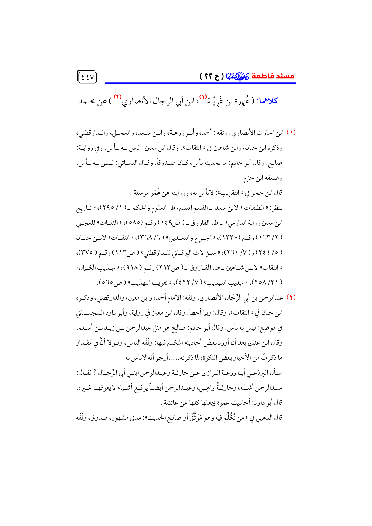 (¬٢) عبدالرحمن بن أبي الرِّجَال الأنصاري. وثقه: الإمام أحمد، وابن معين، والدارقطني، وذكره ابن حبان في «الثقات»، وقال: ربما أخطأ. وقال ابن معين في رواية، وأبو داود السجستاني في موضع: ليس به بأس. وقال أبو حاتم: صالح هو مثل عبدالرحمن بن زيد بن أسلم. وقال ابن عدي بعد أن أورد بعضَ أحاديثه المتكلم فيها: وثَّقَه الناس، ولولا أنَّ في مقدار ما ذكرتُ من الأخبار بعض النكرة، لما ذكرته ..... أرجو أنه لابأس به.