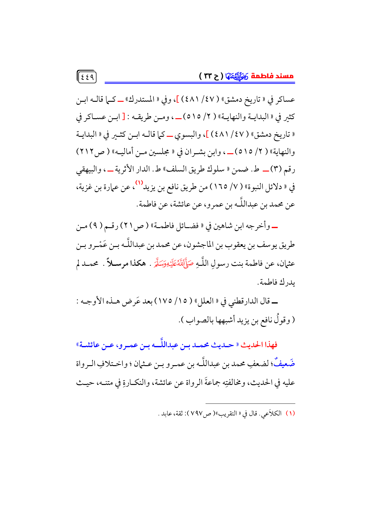 عساكر في «تاريخ دمشق» (٤٧/ ٤٨١)]، وفي «المستدرك» ــ كما قاله ابن كثير في «البداية والنهاية» (٢/ ٥١٥) ـ، ومن طريقه: [ابن عساكر في ... «تاريخ دمشق» (٤٧/ ٤٨١)]، والبسوي ــ كما قاله ابن كثير في «البداية والنهاية» (٢/ ٥١٥) ــ، وابن بشران في «مجلسين من أماليه» (ص ٢١٢) رقم (٣) ــ ط. ضمن «سلوك طريق السلف» ط. الدار الأثرية ــ، والبيهقي في «دلائل النبوة» (٧/ ١٦٥) من طريق نافع بن يزيد (¬١)، عن عمارة بن غزية، عن محمد بن عبداللَّه بن عمرو، عن عائشة، عن فاطمة.