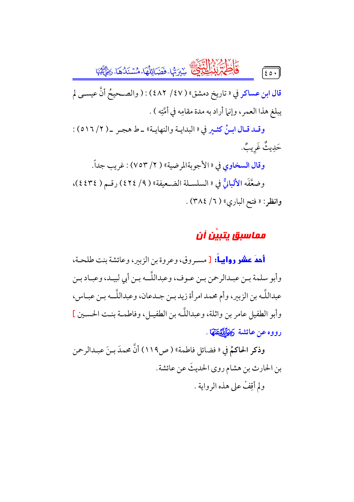 وذكر الحاكمُ في «فضائل فاطمة» (ص ١١٩) أنَّ محمدَ بنَ عبدالرحمن بن الحارث بن هشام روى الحديثَ عن عائشة.
