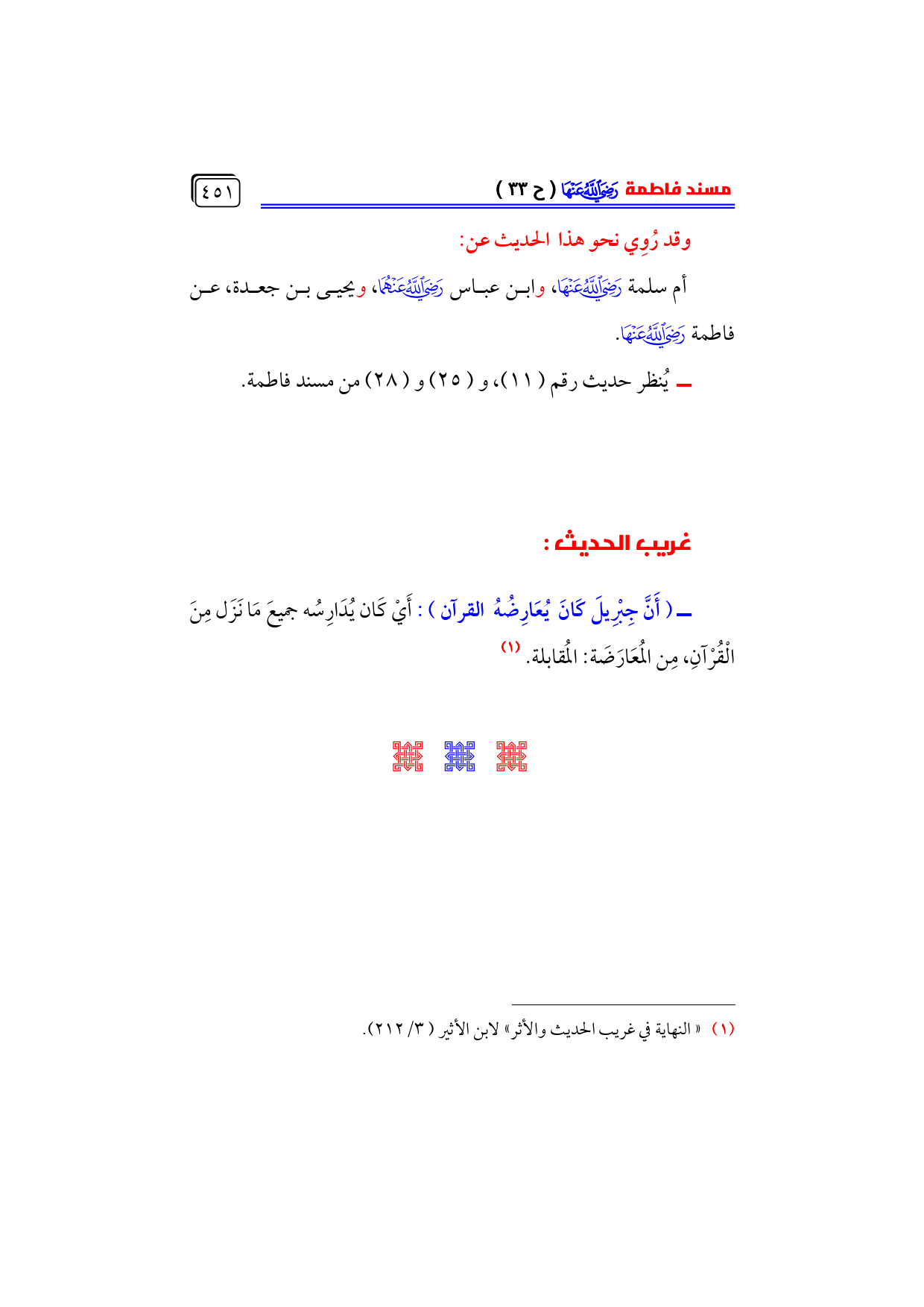 ــ يُنظر حديث رقم (١١)، و (٢٥) و (٢٨) من مسند فاطمة.