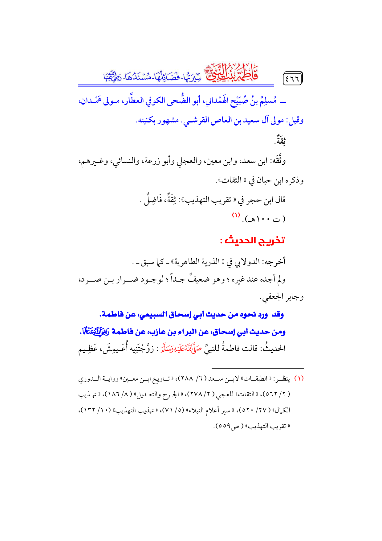 كتاب فاطمة بنت النبي - صلى الله عليه وسلم - سيرتها، فضائلها، مسندها - رضي الله عنها - (اسم الجزء: 6)