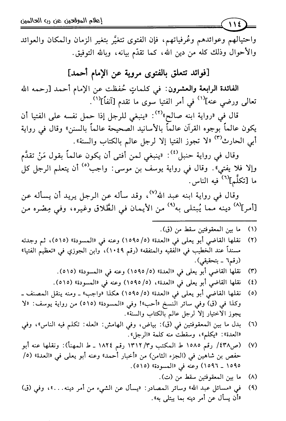 وقال في رواية حنبل (٤): "ينبغي لمن أفتى أن يكون عالمًا يقول مَنْ تقدَّم وإلا فلا يفتي". وقال في رواية يوسف بن موسى: واجب (٥) أن يتعلم الرجل كل ما [تكلَّم] (٦) فيه الناس.
