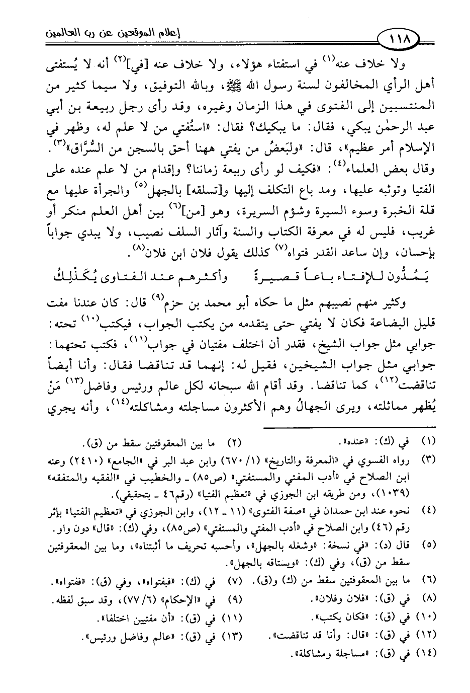 ولا خلاف عنه (١) في استفتاء هؤلاء، ولا خلاف عنه [في] (٢) أنه لا يُستفتى أهل الرأي المخالفون لسنة رسول اللَّه -صلى اللَّه عليه وسلم-، وباللَّه التوفيق، ولا سيما كثير من المنتسبين إلى الفتوى في هذا الزمان وغيره، وقد رأى رجل ربيعة بن أبي عبد الرحمن يبكي، فقال: ما يبكيك؟ فقال: "استُفتي من لا علم له، وظهر في الإِسلام أمر عظيم"، قال: "ولبَعضُ من يفتي هاهنا أحق بالسجن من السُّرَّاق" (٣). وقال بعض العلماء (٤): "فكيف لو رأى ربيعة زماننا؟ وإقدام من لا علم عنده على الفتيا وتوثبه عليها، ومد باع التكلف إليها و [تسلقه] بالجهل (٥) والجرأة عليها مع قلة الخبرة وسوء السيرة وشؤم السريرة، وهو [من] (٦) بين أهل العلم منكر أو غريب، فليس له في معرفة الكتاب والسنة وآثار السلف نصيب، ولا يبدي جوابًا بإحسان، وإن ساعد القدر فتواه (٧) كذلك يقول فلان ابن فلان (٨).
