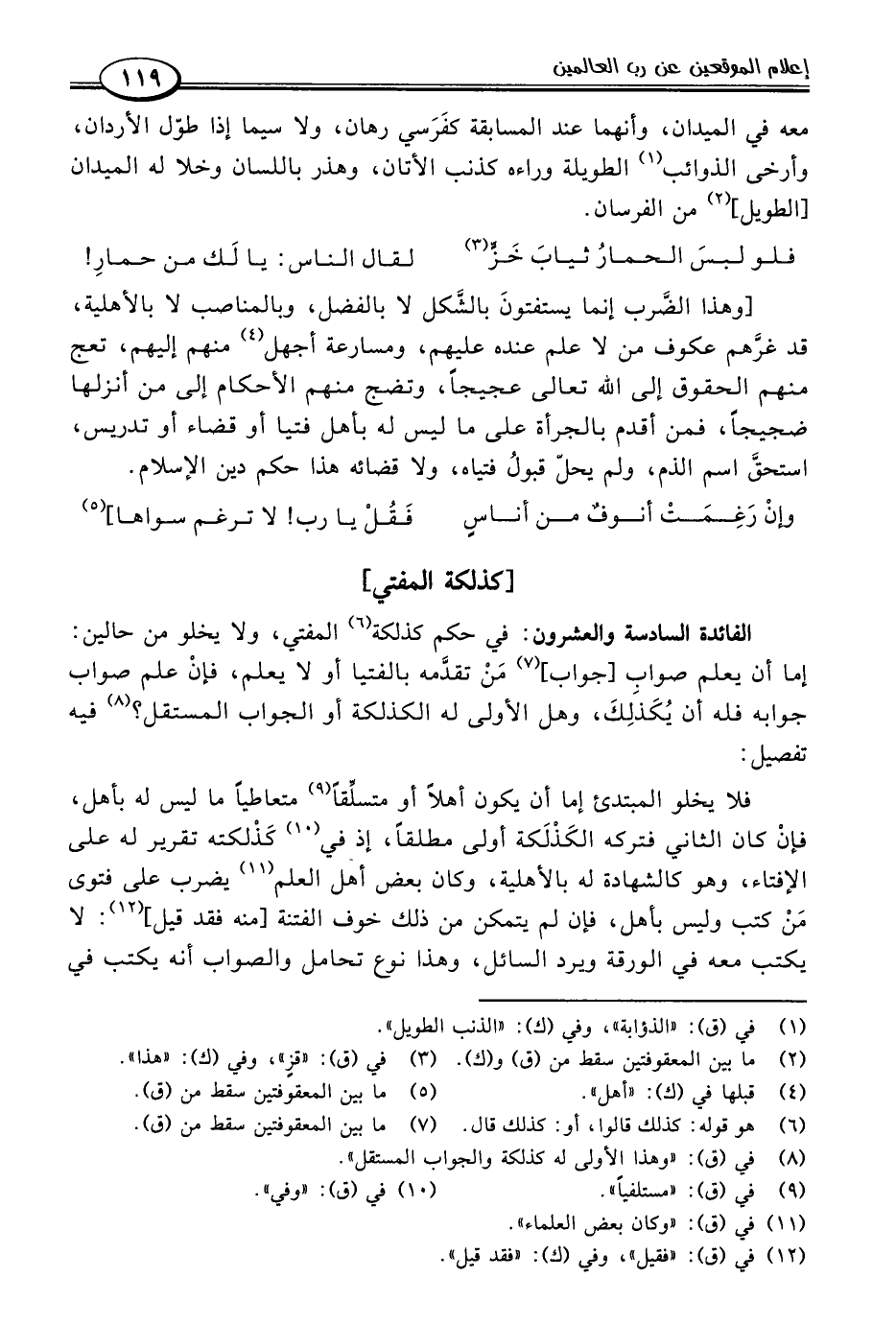 الفائدة السادسة والعشرون: في حكم كذلكة (٦) المفتي، ولا يخلو من حالين: إما أن يعلم صواب [جواب] (٧) مَنْ تقدَّمه بالفتيا أو لا يعلم، فإنْ علم صواب جوابه فله أن يُكَذلِكَ، وهل الأولى له الكذلكة أو الجواب المستقل؟ (٨) فيه تفصيل: