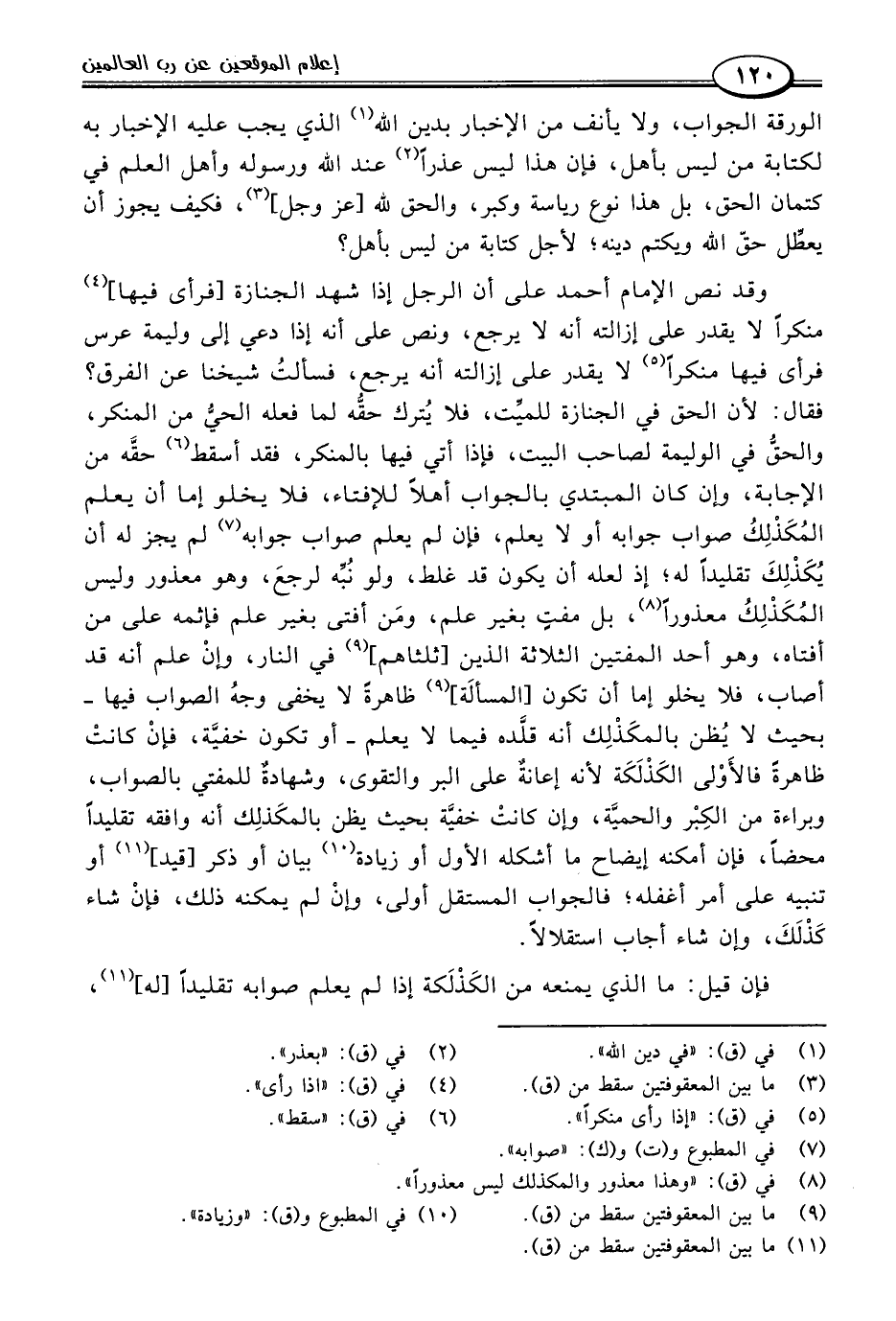 وقد نص الإِمام أحمد على أن الرجل إذا شهد الجنازة [فرأى فيها] (٤) منكرًا لا يقدر على إزالته أنه لا يرجع، ونص على أنه إذا دعي إلى وليمة عرس فرأى فيها منكرًا (٥) لا يقدر على إزالته أنه يرجع، فسألتُ شيخنا عن الفرق؟ فقال: لأن الحق في الجنازة للميِّت، فلا يُترك حقّه لما فعله الحيُّ من المنكر، والحق في الوليمة لصاحب البيت، فإذا أتي فيها بالمنكر، فقد أسقط (٦) حقَّه من الإجابة، وإن كان المبتدي بالجواب أهلًا للإفتاء، فلا يخلو إما أن يعلم المُكَذْلِكُ صواب جوابه أو لا يعلم، فإن لم يعلم صواب جوابه (٧) لم يجز له أن يُكَذْلِكَ تقليدًا له؛ إذ لعله أن يكون قد غلط، ولو نُبّه لرجعَ، وهو معذور وليس المُكَذْلِكُ معذورًا (٨)، بل مفتٍ بغير علم، ومَن أفتى بغير علم فإثمه على من أفتاه، وهو أحد المفتين الثلاثة الذين [ثلثاهم] (٩) في النار، وإنْ علم أنه قد أصاب، فلا يخلو إما أن تكون [المسألَة] (٩) ظاهرةً لا يخفى وجهُ الصواب فيها -بحيث لا يُظن بالمكَذْلِك أنه قلَّده فيما لا يعلم- أو تكون خفيَّة، فإنْ كانتْ ظاهرةً فالأَوْلى الكَذْلَكَة لأنه إعانةٌ على البر والتقوى، وشهادةٌ للمفتي بالصواب، وبراءة من الكِبْر والحميَّة، وإن كانتْ خفيَّة بحيث يظن بالمكَذلِك أنه وافقه تقليدًا محضًا، فإن أمكنه إيضاح ما أشكله الأول أو زيادة (١٠) بيان أو ذكر [قيد] (١١) أو تنبيه على أمر أغفله؛ فالجواب المستقل أولى، وإنْ لم يمكنه ذلك، فإنْ شاء كَذْلَكَ، وإن شاء أجاب استقلالًا.
