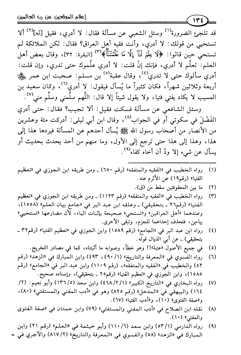 (٣) رواه الخطيب في "الفقيه والمتفقه" (رقم ١١٢٣) -ومن طريقه ابن الجوزي في "تعظيم الفتيا" (رقم ٢٦ - بتحقيقي) - وعلقه ابن عبد البر في "جامع بيان العلم" (١٥٥٨)، وعندهما "أهل العراقيين" و"تستحي" صحيحة بإثبات الياء؛ لأن مضارعها "تستحيي" بياءين، فتحذف إحداهما للجزم، وتبقى الأخرى.
