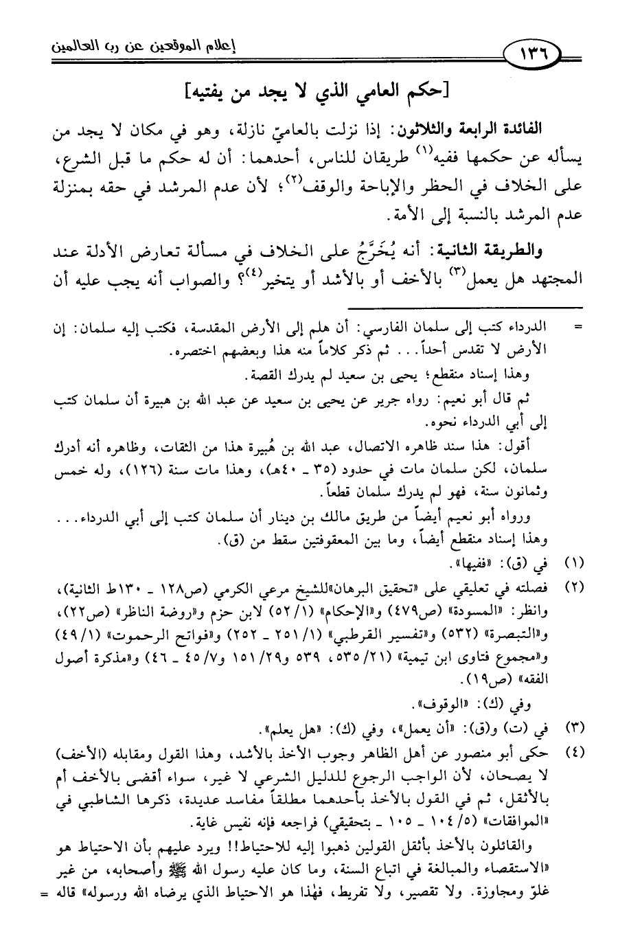 الفائدة الرابعة والثلاثون: إذا نزلت بالعاميّ نازلة، وهو في مكان لا يجد من يسأله عن حكمها ففيه (١) طريقان للناس، أحدهما: أن له حكم ما قبل الشرع، على الخلاف في الحظر والإباحة والوقف (٢)؛ لأن عدم المرشد في حقه بمنزلة عدم المرشد بالنسبة إلى الأمة.