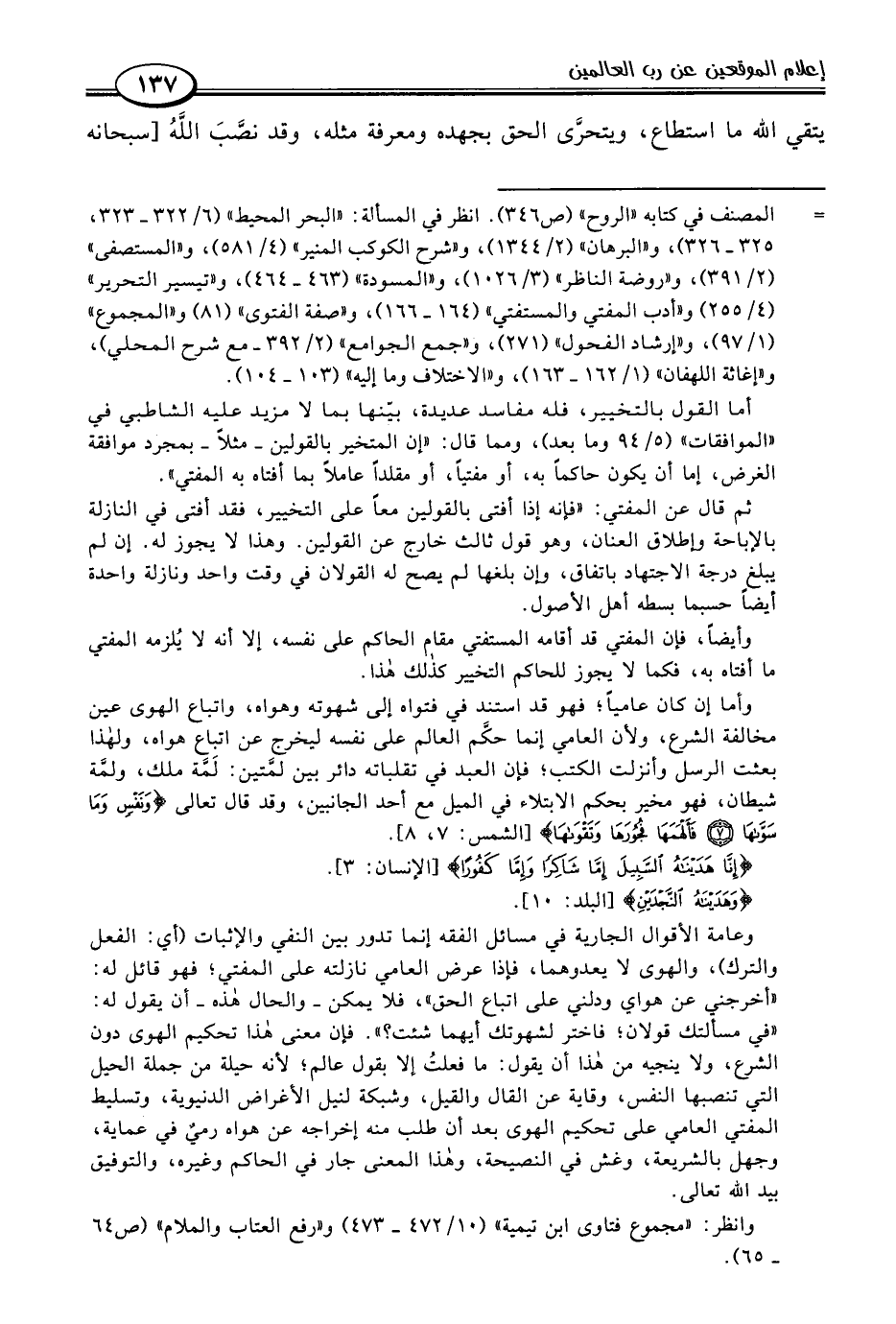 وعامة الأقوال الجارية في مسائل الفقه إنما تدور بين النفي والإثبات (أي: الفعل والترك)، والهوى لا يعدوهما، فإذا عرض العامي نازلته على المفتي؛ فهو قائل له: "أخرجني عن هواي ودلني على اتباع الحق"، فلا يمكن -والحال هذه- أن يقول له: "في مسألتك قولان؛ فاختر لشهوتك أيهما شئت؟ ". فإن معنى هذا تحكيم الهوى دون الشرع، ولا ينجيه من هذا أن يقول: ما فعلتُ إلا بقول عالم؛ لأنه حيلة من جملة الحيل التي تنصبها النفس، وقاية عن القال والقيل، وشبكة لنيل الأغراض الدنيوية، وتسليط المفتي العامي على تحكيم الهوى بعد أن طلب منه إخراجه عن هواه رميٌ في عماية، وجهل بالشريعة، وغش في النصيحة، وهذا المعنى جار في الحاكم وغيره، والتوفيق بيد اللَّه تعالى.