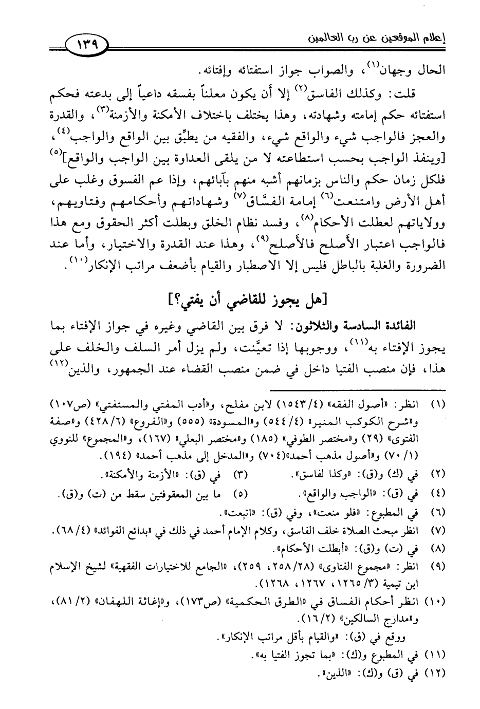 الفائدة السادسة والثلاثون: لا فرق بين القاضي وغيره في جواز الإفتاء بما يجوز الإفتاء به (١١)، ووجوبها إذا تعيَّنت، ولم يزل أمر السلف والخلف على هذا، فإن منصب الفتيا داخل في ضمن منصب القضاء عند الجمهور، والذين (١٢)