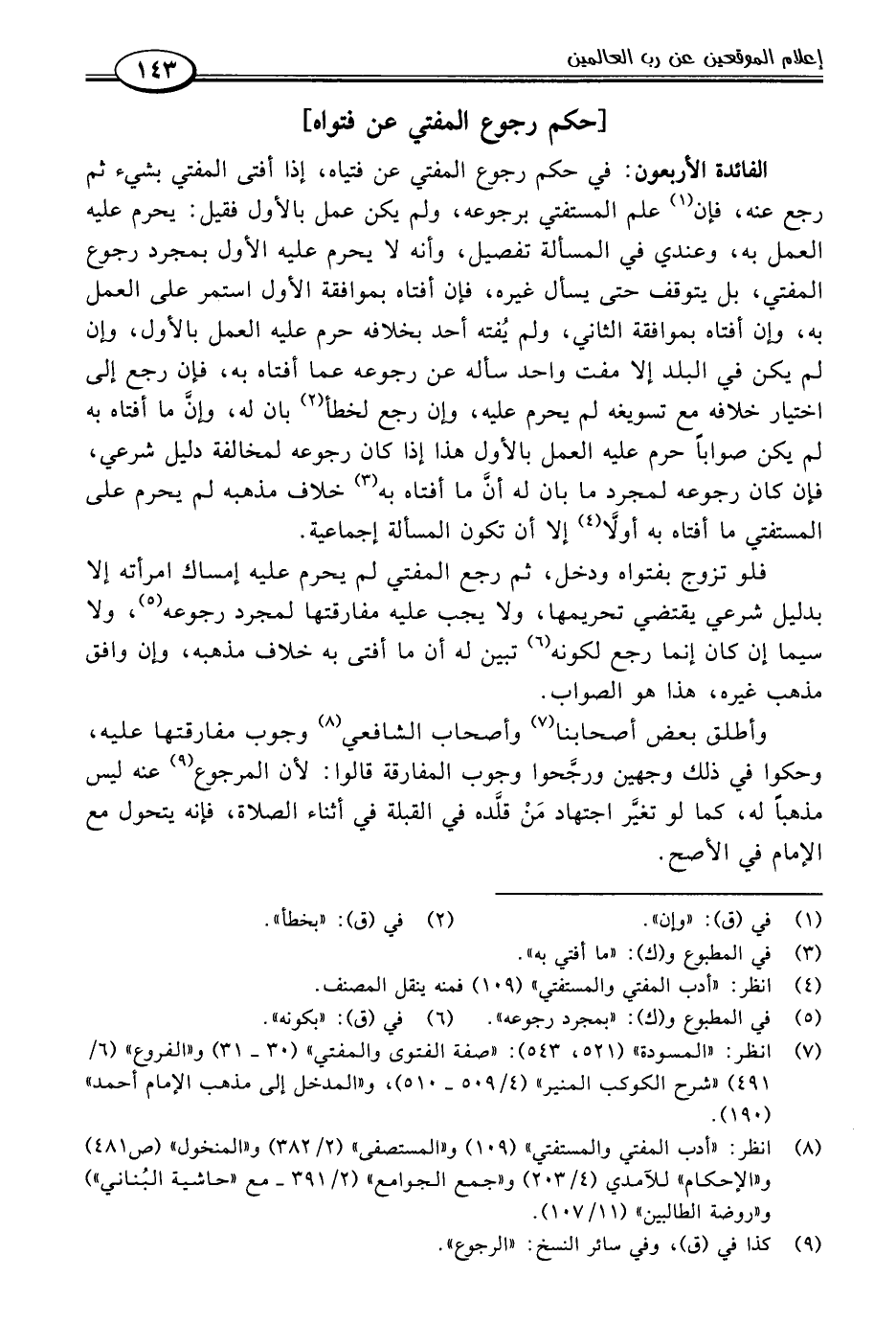 (٤) انظر: "أدب المفتي والمستفتي" (١٠٩) فمنه ينقل المصنف.