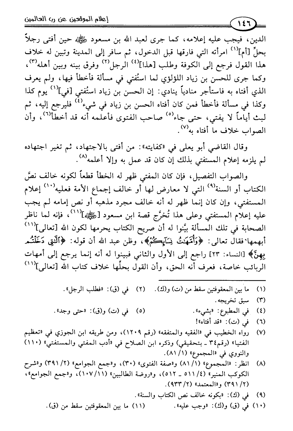 والصواب التفصيل، فإن كان المفتي ظهر له الخطأ قطعًا لكونه خالف نصَّ الكتاب أو السنة (٩) التي لا معارض لها أو خالف إجماع الأمة فعليه (١٠) إعلام المستفتي، وإن كان إنما ظهر له أنه خالف مجرد مذهبه أو نص إمامه لم يجب عليه إعلام المستفتي وعلى هذا تُخرَّج قصة ابن مسعود [-رضي اللَّه عنه-] (١١)، فإنه لما ناظر الصحابة في تلك المسألة بيَّنوا له أن صريح الكتاب يحرمها لكون اللَّه [تعالى] (١١) أبهمها فقال تعالى: {وَأُمَّهَاتُ نِسَائِكُمْ}، وظن عبد اللَّه أن قوله: {اللَّاتِي دَخَلْتُمْ بِهِنَّ} [النساء: ٢٣] راجع إلى الأول والثاني فبينوا له أنه إنما يرجع إلى أمهات الربائب خاصة، فعرف أنه الحق، وأن القول بحلِّها خلاف كتاب اللَّه [تعالى] (١١)