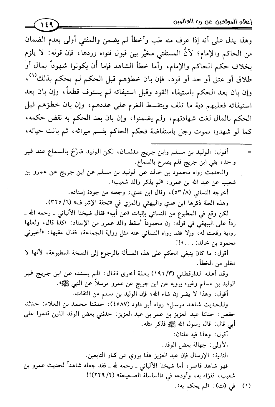 وهذا يدل على أنه إذا عرف منه طب وأخطأ لم يضمن والمفتي أولى بعدم الضمان من الحاكم والإمام؛ لأنَّ المستفتي مخيَّر بين قبول فتواه وردها، فإن قوله: لا يلزم بخلاف حكم الحاكم والإمام، وأما خطأ الشاهد فإما أَن يكونوا شهودًا بمال أو طلاق أو عتق أو حد أو قود، فإن بأن خطؤهم قبل الحكم لم يحكم بذلك (١)، وإن بأن بعد الحكم باستيفاء القود وقبل استيفائه لم يستوف قطعًا، وإن بأن بعد استيفائه فعليهم دية ما تلف ويتقسط الغرم على عددهم، وإن بأن خطؤهم قبل الحكم بالمال لغت شهادتهم، ولم يضمنوا، وإن بأن بعد الحكم به نقض حكمه، كما لو شهدوا بموت رجل باستفاضة فحكم الحاكم بقسم ميراثه، ثم بانت حياته،