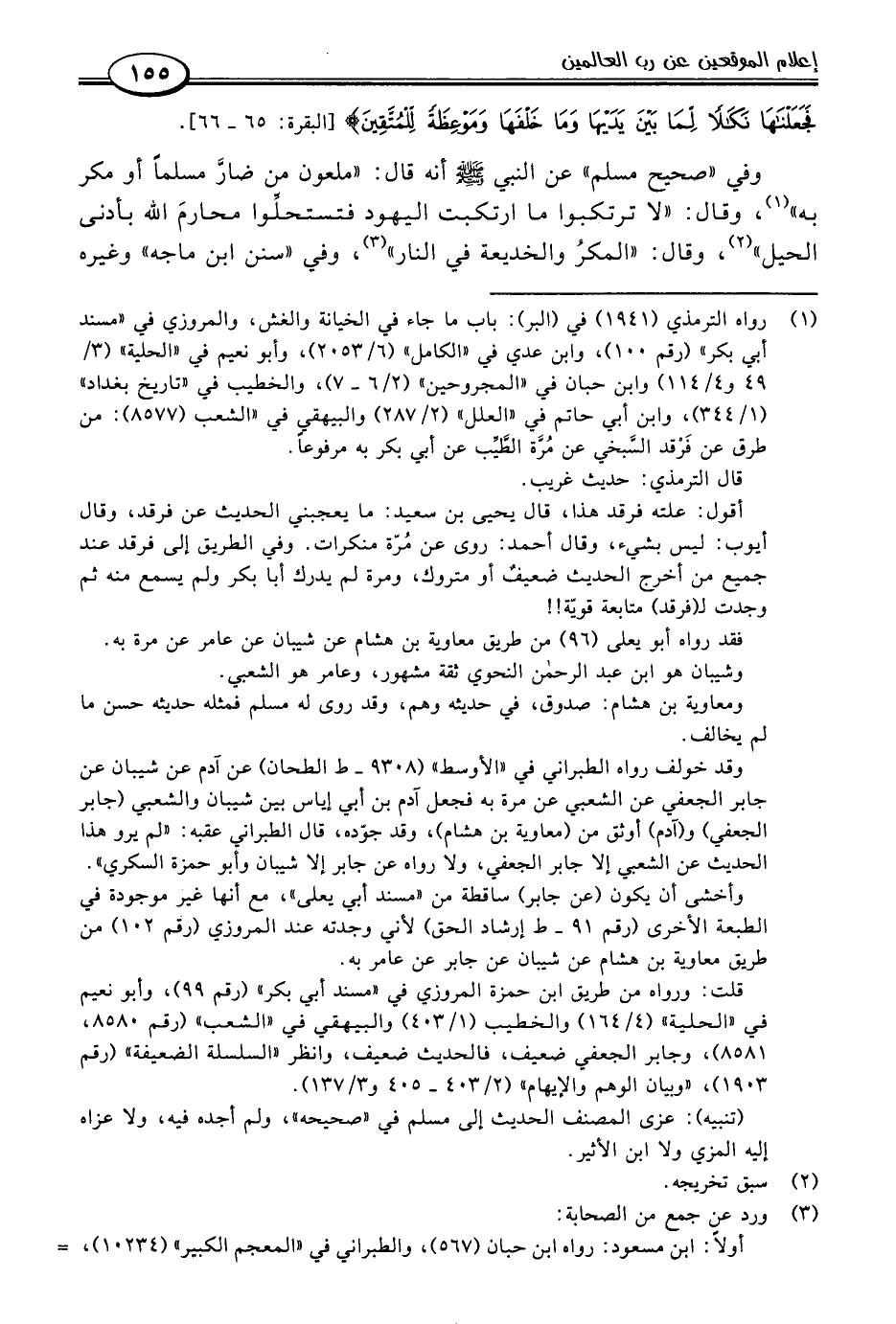 وفي "صحيح مسلم" عن النبي -صلى اللَّه عليه وسلم- أنه قال: "ملعون من ضارَّ مسلمًا أو مكر به" (١)، وقال: "لا ترتكبوا ما ارتكبت اليهود فتستحلِّوا محارمَ اللَّه بأدنى الحيل" (٢)، وقال: "المكرُ والخديعة في النار" (٣)، وفي "سنن ابن ماجه" وغيره