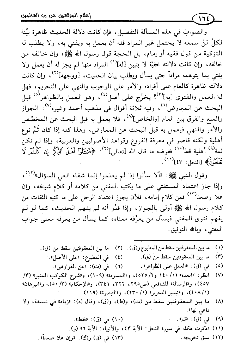 وقول النبي -صلى اللَّه عليه وسلم-: "ألا سألوا إذا لم يعلموا إنما شفاء العي السؤال" (١٢)، وإذا جاز اعتماد المستفتي على ما يكتبه المفتي من كلامه أو كلام شيخه، وإن علا وصعد (١٣) فمن كلام إمامه، فلأن يجوز اعتماد الرجل على ما كتبه الثقات من كلام رسول اللَّه -صلى اللَّه عليه وسلم- أولى بالجواز، وإذا قدِّر أنه لم يفهم الحديث، كما لو لم يفهم فتوى المفتي فيسأل من يعرِّفه معناه، كما يسأل من يعرفه معنى جواب المفتي، وباللَّه التوفيق.