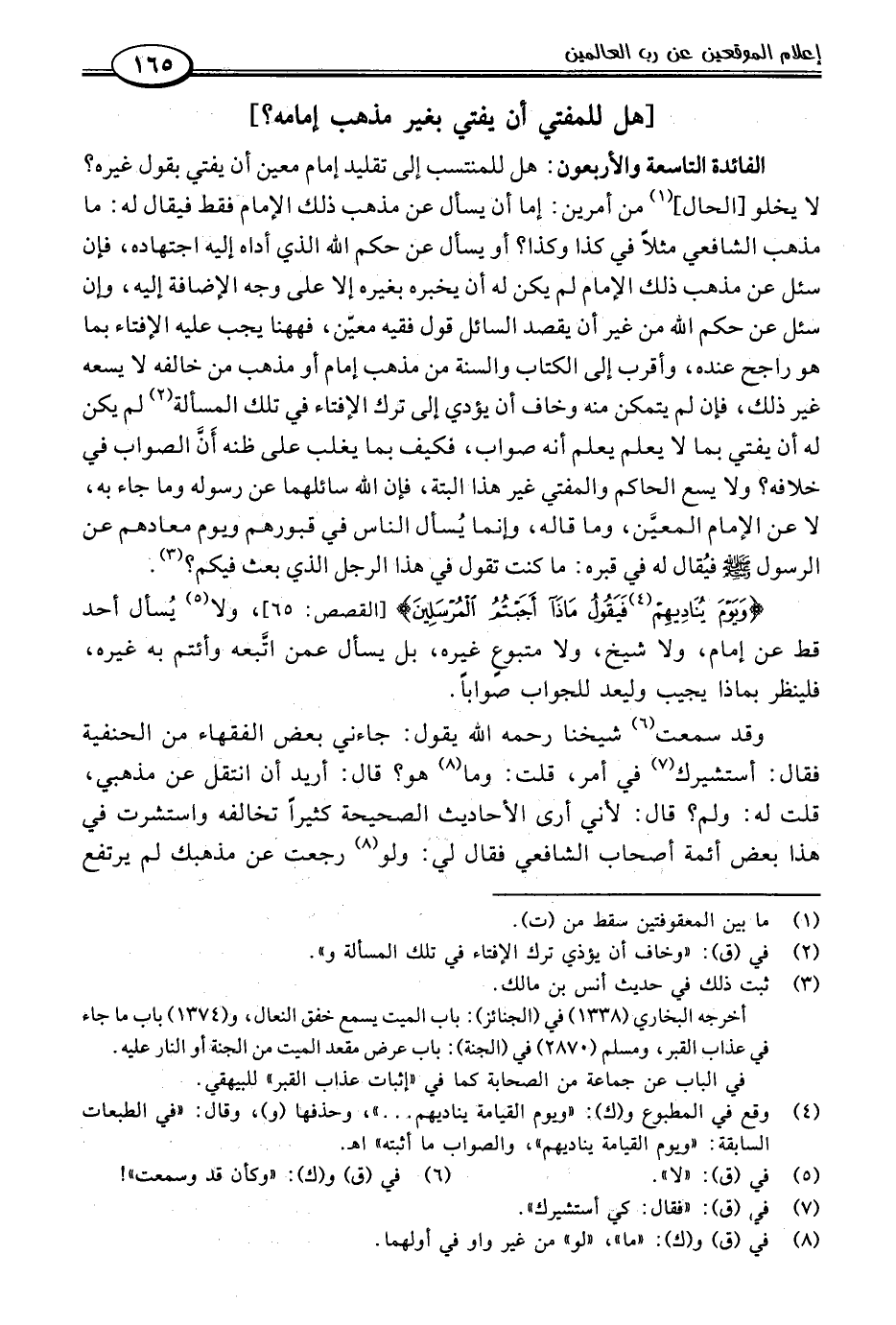 الفائدة التاسعة والأربعون: هل للمنتسب إلى تقليد إمام معين أن يفتي بقول غيره؟ لا يخلو [الحال] (١) من أمرين: إما أن يسأل عن مذهب ذلك الإمام فقط فيقال له: ما مذهب الشافعي مثلًا في كذا وكذا؟ أو يسأل عن حكم اللَّه الذي أداه إليه اجتهاده، فإن سئل عن مذهب ذلك الإمام لم يكن له أن يخبره بغيره إلا على وجه الإضافة إليه، وإن سئل عن حكم اللَّه من غير أن يقصد السائل قول فقيه معيّن، فههنا يجب عليه الإفتاء بما هو راجح عنده، وأقرب إلى الكتاب والسنة من مذهب إمام أو مذهب من خالفه لا يسعه غير ذلك، فإن لم يتمكن منه وخاف أن يؤدي إلى ترك الإفتاء في تلك المسألة (٢) لم يكن له أن يفتي بما لا يعلم يعلم أنه صواب، فكيف بما يغلب على ظنه أَنَّ الصواب في خلافه؟ ولا يسع الحاكم والمفتي غير هذا البتة، فإن اللَّه سائلهما عن رسوله وما جاء به، لا عن الإمام المعيَّن، وما قاله، وإنما يُسأل الناس في قبورهم ويوم معادهم عن الرسول -صلى اللَّه عليه وسلم- فيُقال له في قبره: ما كنت تقول في هذا الرجل الذي بعث فيكم؟ (٣).