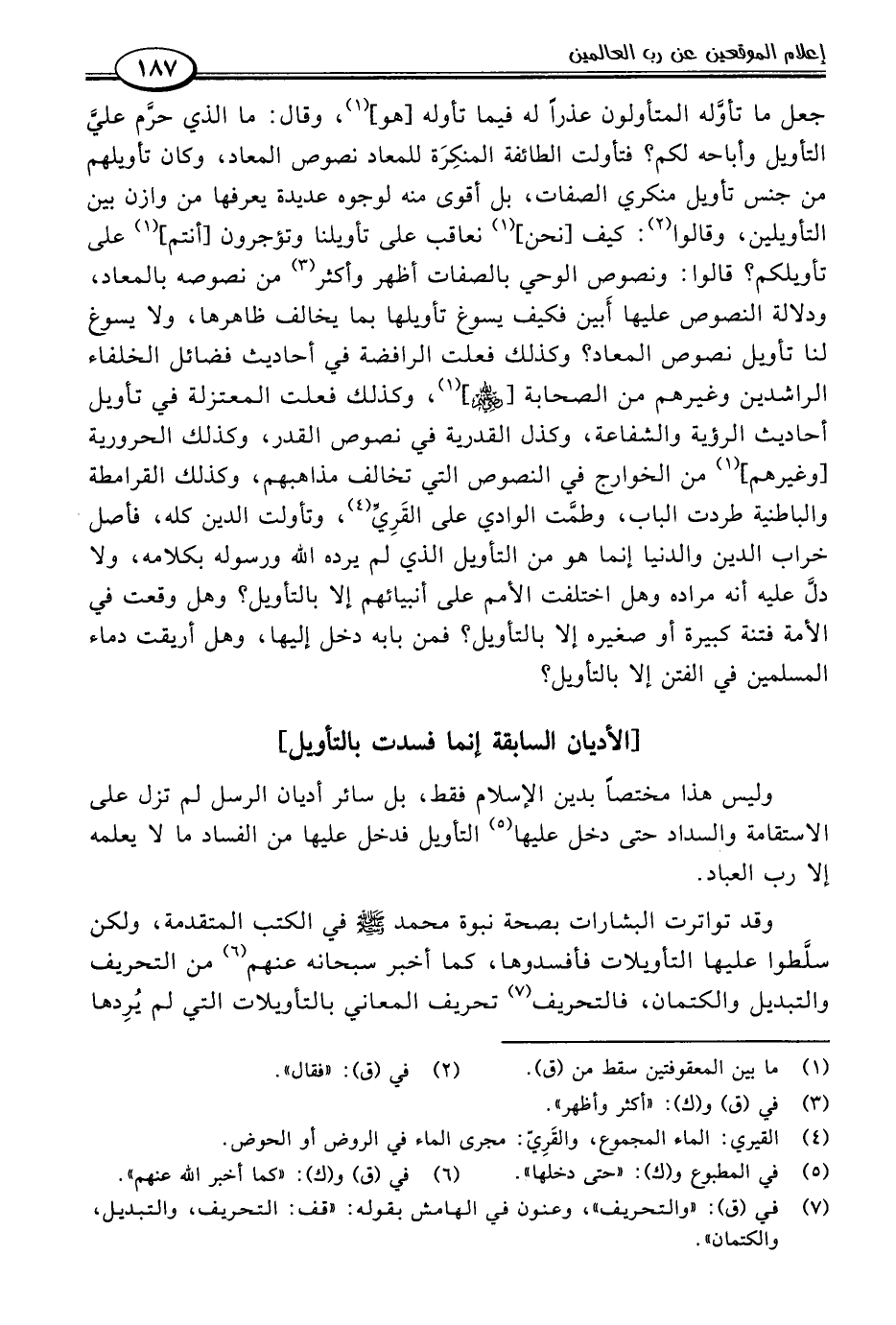وليس هذا مختصًا بدين الإسلام فقط، بل سائر أديان الرسل لم تزل على الاستقامة والسداد حتى دخل عليها (٥) التأويل فدخل عليها من الفساد ما لا يعلمه إلا رب العباد.