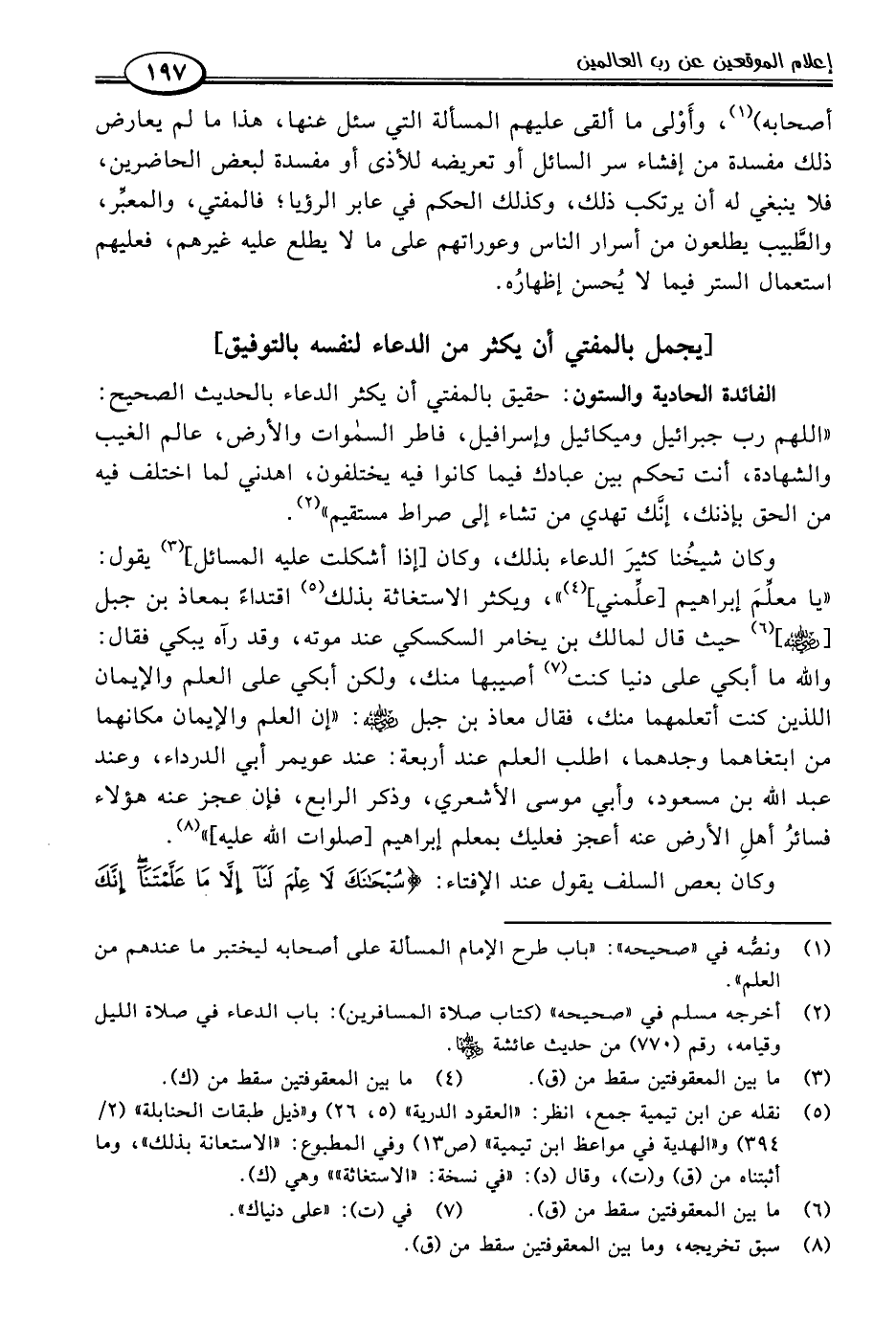 الفائدة الحادية والستون: حقيق بالمفتي أن يكثر الدعاء بالحديث الصحيح: "اللهم رب جبرائيل وميكائيل وإسرافيل، فاطر السموات والأرض، عالم الغيب والشهادة، أنت تحكم بين عبادك فيما كانوا فيه يختلفون، اهدني لما اختلف فيه من الحق بإذنك، إنَّك تهدي من تشاء إلى صراط مستقيم" (٢).