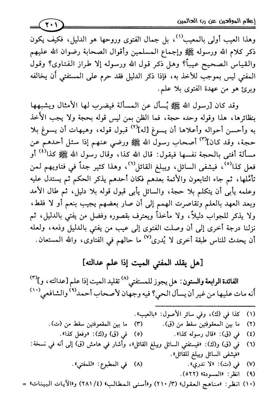 وقد كان [رسول اللَّه -صلى اللَّه عليه وسلم- يُسأل عن المسألة فيضرب لها الأمثال ويشبهها بنظائرها، هذا وقوله وحده حجة، فما الظن بمن ليس قوله بحجة ولا يجب الأَخذ به وأحسن أحواله وأعلاها أن يسوغ [له] (٢) قبول قوله، وهيهات أن يسوغ بلا حجة، وقد كان] (٣) أصحاب رسول اللَّه -صلى اللَّه عليه وسلم- ورضي عنهم إذا سئل أحدهم عن مسألة أفتى بالحجة نفسها فيقول: قال اللَّه كذا، وقال رسول اللَّه -صلى اللَّه عليه وسلم- كذا (٤) أو فعل كذا (٥)، فيشفى السائل، ويبلغ القائل (٦)، وهذا كثير جدًا في فتاويهم لمن تأمَّلها، ثم جاء التابعون والأئمة بعدهم فكان أحدهم يذكر الحكم ثم يستدل عليه وعلمه يأبى أن يتكلم بلا حجة، والسائل يأبى قبول قوله بلا دليل، ثم طال الأمد وبعد العهد بالعلم وتقاصرت الهمم إلى أن صار بعضهم يجيب بنعم أو لا فقط، ولا يذكر للجواب دليلًا، ولا مأخذًا ويعترف بقصوره وفضل من يفتي بالدليل، ثم نزلنا درجة أخرى إلى أن وصلت الفتوى إلى عيب من يفتي بالدليل وذمه، ولعله أن يحدث للناس طبقة أخرى لا يُدرى (٧) ما حالهم في الفتاوى، واللَّه المستعان.