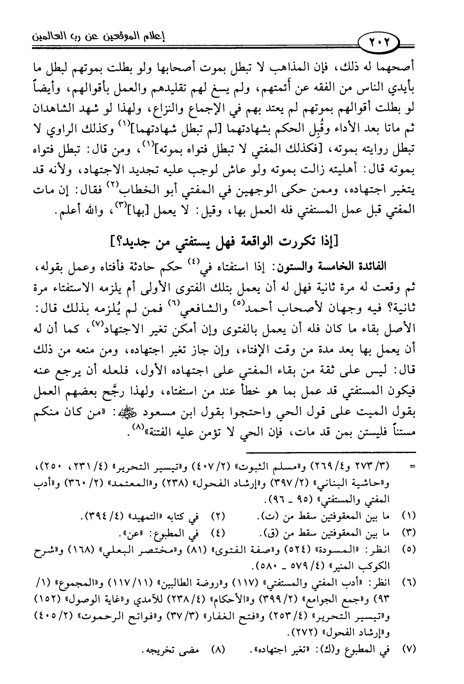 الفائدة الخامسة والستون: إذا استفتاه في (٤) حكم حادثة فأفتاه وعمل بقوله، ثم وقعت له مرة ثانية فهل له أن يعمل بتلك الفتوى الأولى أم يلزمه الاستفتاء مرة ثانية؟ فيه وجهان لأصحاب أحمد (٥) والشافعي (٦) فمن لم يُلزمه بذلك قال: الأصل بقاء ما كان فله أن يعمل بالفتوى وإن أمكن تغير الاجتهاد (٧)، كما أن له أن يعمل بها بعد مدة من وقت الإفتاء، وإن جاز تغير اجتهاده، ومن منعه من ذلك قال: ليس على ثقة من بقاء المفتي على اجتهاده الأول، فلعله أن يرجع عنه فيكون المستفتي قد عمل بما هو خطأ عند من استفتاه، ولهذا رجَّح بعضهم العمل بقول الميت على قول الحي واحتجوا بقول ابن مسعود -رضي اللَّه عنه-: "من كان منكم مستنًا فليستن بمن قد مات، فإن الحي لا تؤمن عليه الفتنة" (٨).