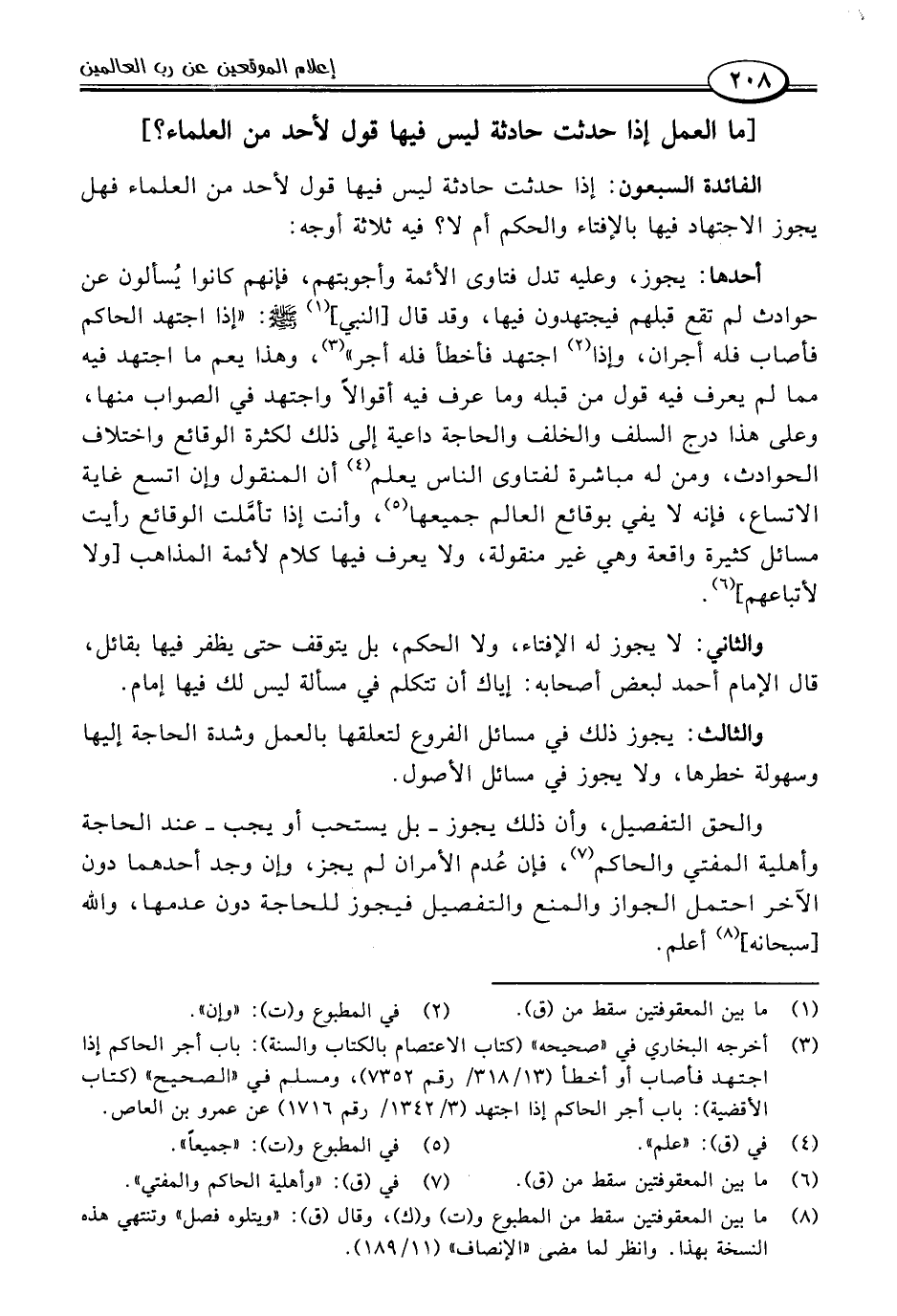 الفائدة السبعون: إذا حدثت حادثة ليس فيها قول لأحد من العلماء فهل يجوز الاجتهاد فيها بالإفتاء والحكم أم لا؟ فيه ثلاثة أوجه: